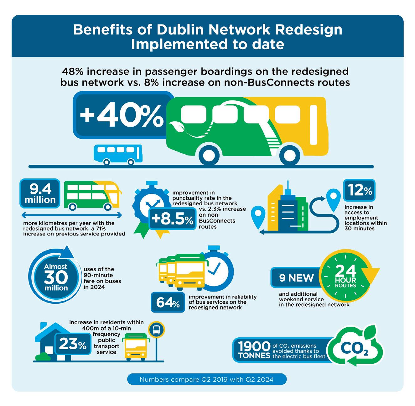In public transport, we are now progressing several major projects nationwide which will significantly improve Ireland's transport system. BusConnects is a transformative programme of investment in the bus system, providing better bus services across our cities. In Dublin, the major infrastructure element of BusConnects comprises the Core Bus Corridor schemes. These corridors aim to provide over 200km of enhanced bus and cycling infrastructure in Dublin. I am pleased to say that An Bord Pleanála has approved all 12 Core Bus Corridor applications in Dublin. My department aims to have the first of the Core Bus Corridors in construction this year.