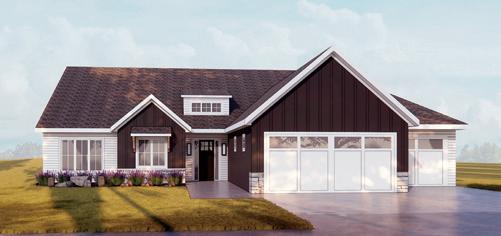 Rudnick Construction’s newest ranch-style cottage has everything you need and more! Located in the Meadows at Hawktree, you have access to the private community pool and clubhouse. Designed by Alexa Kingery of Alexa by Design, the home itself has a beautiful, open floor plan. The kitchen has painted beige and mediumstained white oak cabinetry, quartz countertops, a custom hood, and a large walk-in pantry. The living room features tons of natural light and a custom stone fireplace. The primary suite offers a spacious bedroom, custom-tiled shower, freestanding tub, and large walk-in closet. There is an office, two additional bedrooms, laundry/mudroom, and 1.5