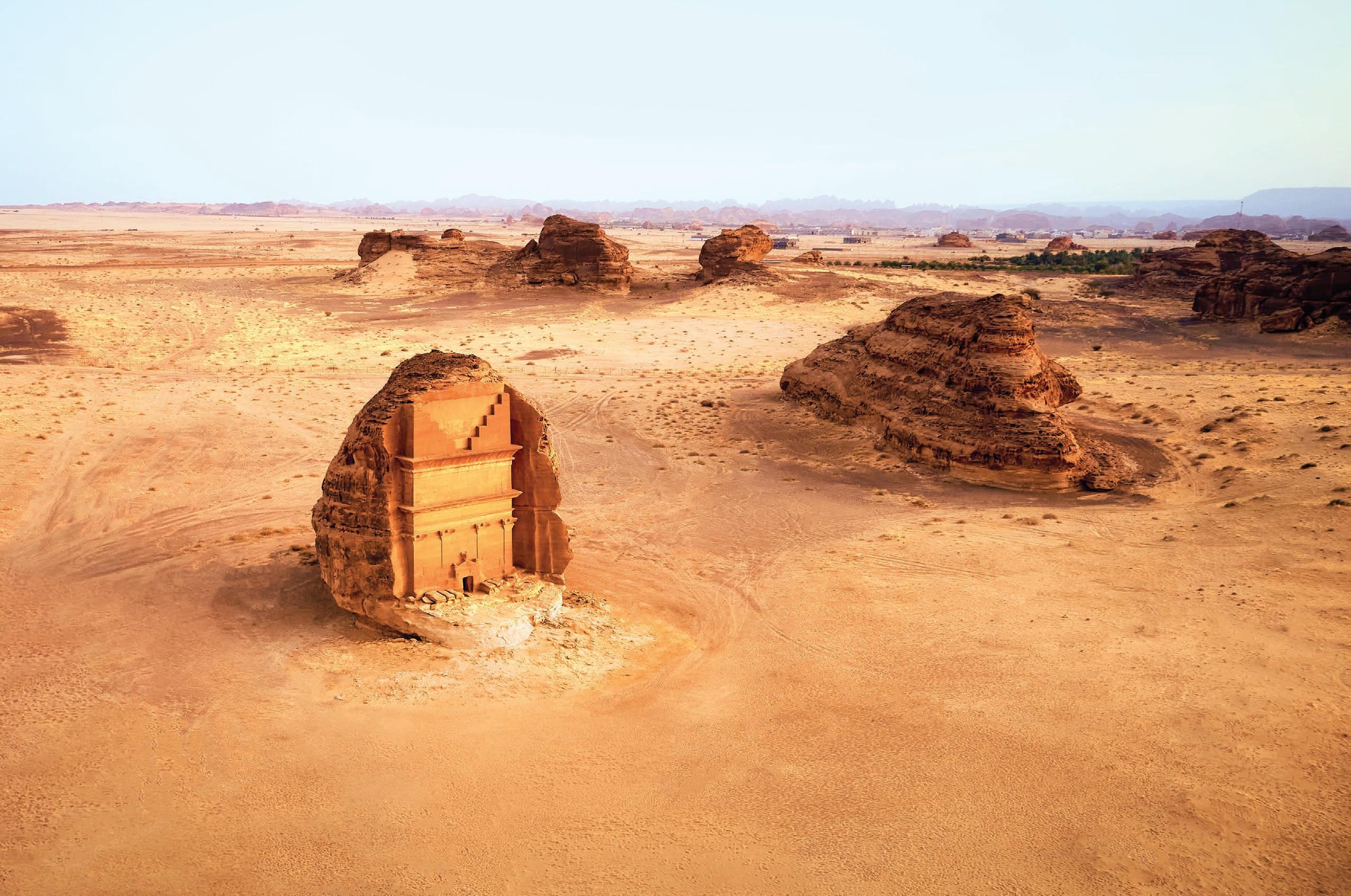 A perfect AlUla itinerary - four nights and five days including economy flights, two nights at Banyan Tree AlUla with breakfast, two nights at Habitas AlUla with breakfast, a Vintage Land Rover tour of Hegra, Dadan and Jabal Ikmah, plus a 30-minute helicopter tour and ground transfers in AlUla.