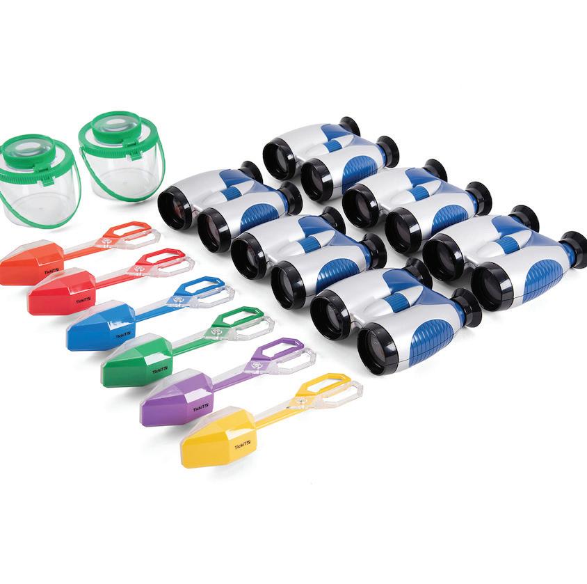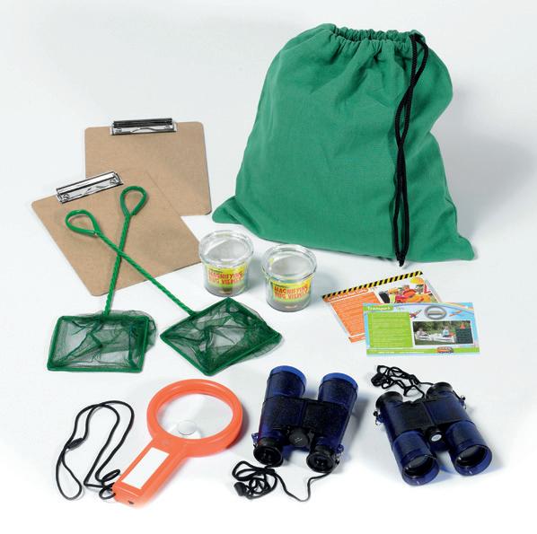 Rinkinyje rasite 14 vnt. įvairių priemonių, skirtų tyrinėti lauke.