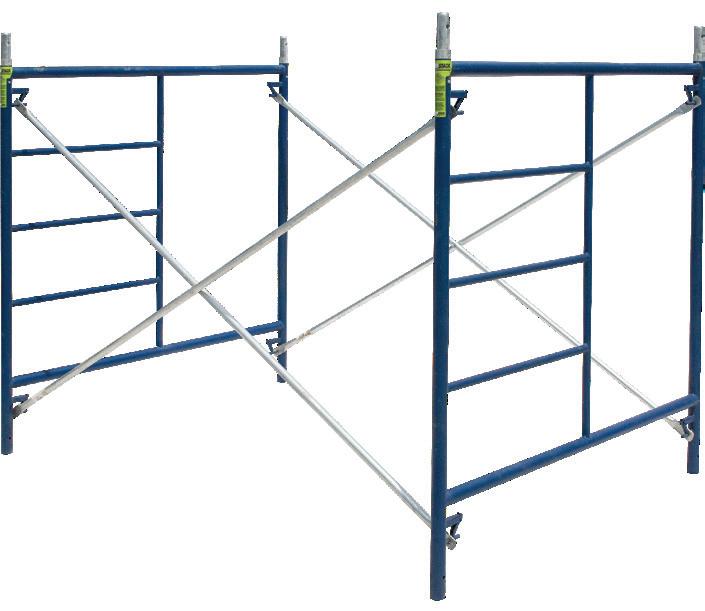 ENS. D’ÉCHAFAUDAGE EN ACIER PEINT 2 cadres, 2 croisillons, 4 goupilles et 4 verrous inclus. PAINTED STEEL SCAFFOLDING SET 2 frames, 2 crossbraces, 4 coupling pins and 4 spring lock arms included.