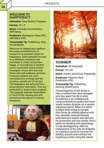Welcome to Happycracy explores the many contradictions of humans in a constant quest for happiness. Each episode focuses on a different company that promises to make consumers happy. A microphone is handed out to customers and business managers: those who buy and those who sell wellness services. Everyone speaks out, until contradictions emerge and the situation spirals out of control. The dialogues are extracts from documentary interviews. They are embodied in stop-motion puppets. The puppets express themselves in front of the camera and will sometimes be placed in various situations.
