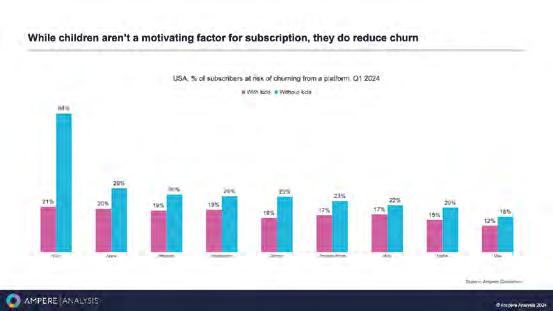 However, Ampere’s consumer data also shows that subscribers who live in households with children are less likely to churn than consumers with no children. This means that while companies have reduced their commissioning budgets for children’s content, they are acquiring more children’s content for their platforms in favour of Original content in order to appease this important consumer group.