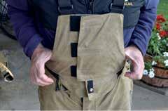 Above Left, Aerostich’s Bib Converter zips to the back of the pants and increases protection from the elements, with wide suspenders keeping the weight off the waist.. The pants can also be zipped to the back of the jacket. Above Right, Though my wife seemed a little too enthusiastic about drilling me with a pressure washer, the Cousin Jeremy outfit still only permitted a few drops in where the jacket overlaps the pants.