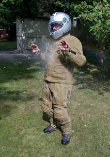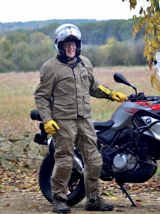The Cousin Jeremy certainly cuts the wind, keeping me snug in temps down to the lower 40’s with just a fleece and jeans on underneath. I expected the outfit to be hot, but was surprised how cool I remained when temps got into the 80’s; wearing shorts or jeans and a t-shirt, unzipping the under arm and back vents on the jacket and opening the wrist zippers and cuff fasteners really moved the air, especially with the jacket’s main zipper down a ways. The double zipper on the pant legs can also be adjusted to keep your nether regions ventilated. Whether a one-piece suit or jacket/pant combo, the Cousin Jeremy is about as hot in stop-andgo traffic as any non-mesh protective clothing. As Aerostich notes in their catalogue, the Cousin Jeremy is Street/ Touring wear; for ADV I’d recommend something in Cordura.