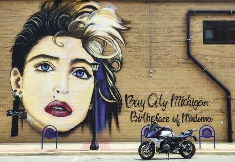 Middle left, A mural of pop singer Madonna on the City Market building in Bay City, Michigan, provides the backdrop for Mark Bartreau's (#215490) R 1200 RS.