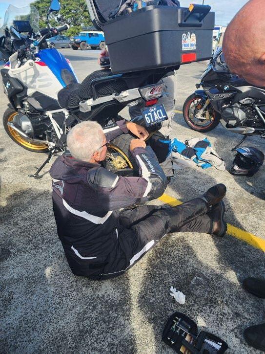 Then we come to the mid-week ride which Gary Bennett organized and led from BP Stapleton to Chillingham Hotel via Hinze dam cafe. The bar had been raised from the last mid-week ride and it was an absolute sensational ride day. From start to finish I loved every second of it. At the start Andy found he had a slow releasing puncture on his 1250 GS rear Tyre. Upon hearing the word puncture, old mate Daryl Masterson jumped into action just like he did down in Denmark WA when I had a puncture in my rear Tyre [ED: see repair action photos on page 7]. He had Andy’s bike up and running in no time and off we all went on one of the best mid-week rides I have been on. Thanks Gary for a scorcher of a day.