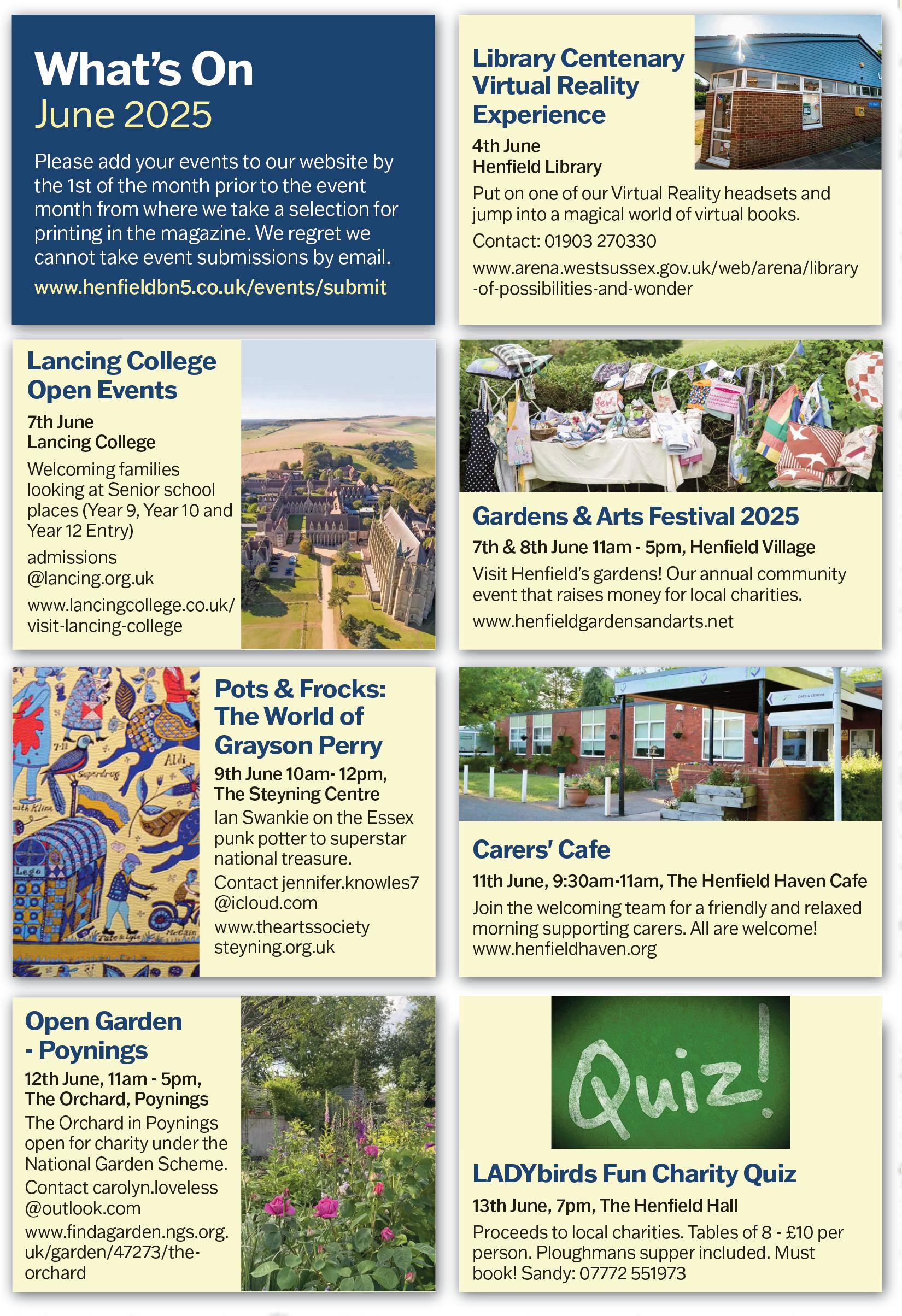 Ifyouhavealocalintereststoryforuspleaseemaileditor@bn5magazine.co.uk.Ifyournot-for-profitclub,grouporcharityhasan eventyouwouldlikeustopublishonourwhat’sonpages,pleasesubmitviaourwebsitewww.henfieldbn5.co.uk,thisgivesyou additionalautomaticwebsiteentry.Pleasenotewenolongeracceptpostaloremaildiarysubmissions.Priorityisgiventolocal, charitableandnon-repeatingeventswhenweareoversubscribed.AdvertiserTermsandConditionsandallDisclaimersappearon ourwebsite.