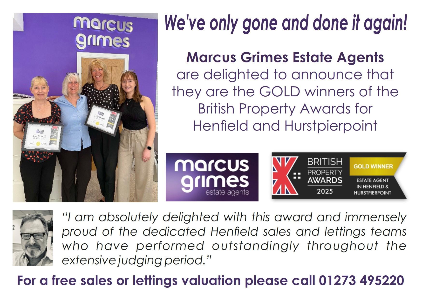 Marcus Grimes Estate Agents are delighted to announce that they are the gold winners of the British Property Awards 2025 for Henfield & Hurstpierpoint for the third successive year.