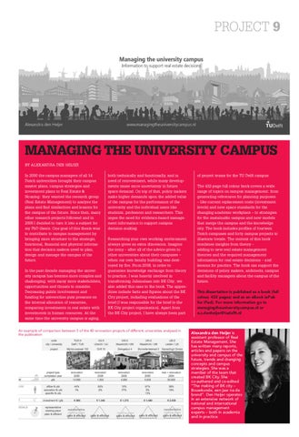 MANAGING THE UNIVERSITY CAMPUS BY ALEXANDRA DEN HEIJER In 2000 the campus managers of all 14 Dutch universities brought their campus master plans, campus strategies and investment plans to Real Estate & Housing: they wanted the research group (Real Estate Management) to analyse the plans and find similarities and lessons for the campus of the future. Since then, many other research projects followed and in 2005 I decided to turn it into a subject for my PhD thesis. One goal of this thesis was to contribute to campus management by bringing more structure to the strategic, functional, financial and physical information that decision makers need to plan, design and manage the campus of the future. In the past decade managing the university campus has become more complex and challenging, with many more stakeholders, opportunities and threats to consider. Decreasing public involvement and funding for universities puts pressure on the internal allocation of resources, comparing investments in real estate with investments in human resources. At the same time the university campus is aging,