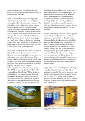 doesn't stand out in the Mercedes parade, and doesn't shy away from the play of the city, and enjoys disappearing in the crowd. When we commute we exercise our “right to the city”, we participate, and share responsibility to certain places. The tube station, the bus interior, the cycling lane, or the road crossing are the stages of our everyday life. They are extremely popular. Anyone who lives in Rotterdam would have been in station Blaak at least once, enjoying the sequence of colours and tiles, the weirdly ornamented escalators, or maybe that ‘ordinary’ archaeological display. More importantly, they have a common language, they speak to the citizens in similar ways according to place. They take responsibility in representing the city as a whole, of being its ultimate image, one that is either pop or niche, to our own desire.