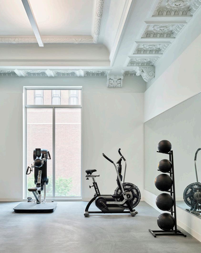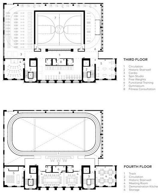 After significant study to reuse the existing amphitheater, it was determined that removing this portion of the building allowed the primary function of the building to transition from musical performance to health and fitness while also making necessary code and accessibility updates to the facility. This new construction provides a more streamlined and navigable building to create clear paths and greater accessibility for all building users. In order to maintain the original streetscape massing and historic character of the building, the design team reviewed the historic detailing and worked closely with the contractor and owner to set expectations for reconstruction of the historic west façade, and careful restoration and preservation of the remaining edifice. This reconstructed façade is delineated from the historic but blends seamlessly with the existing fabric, meeting the owner’s vision and community interests.