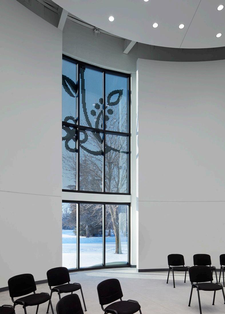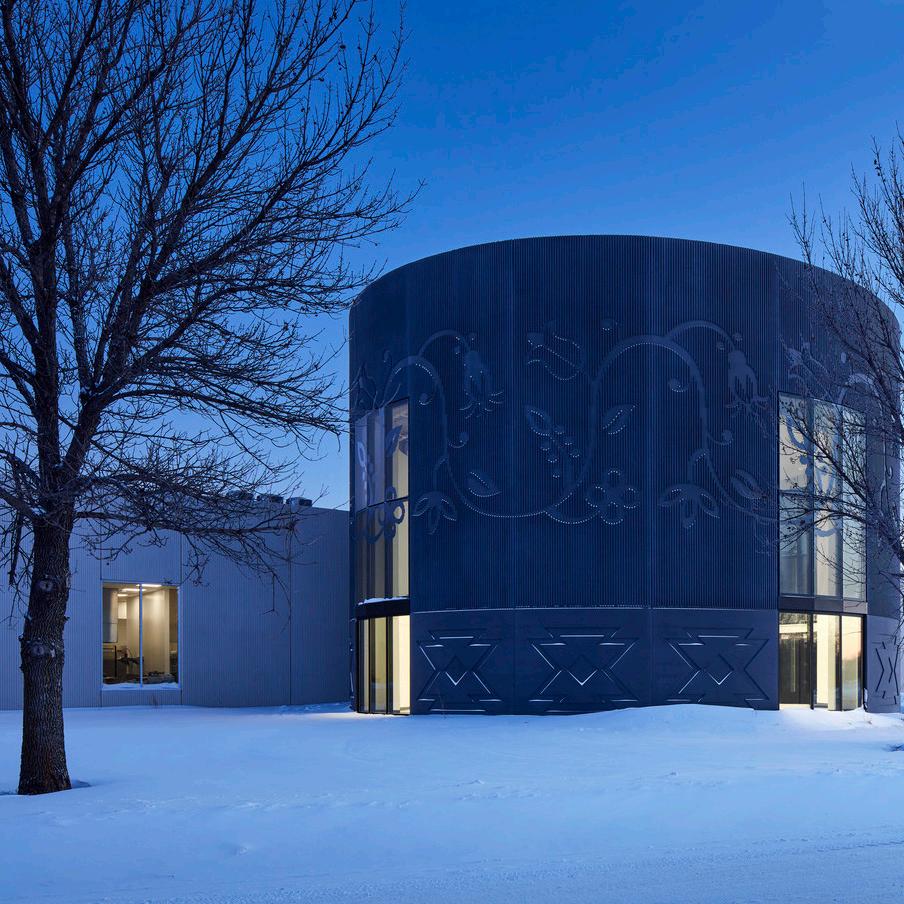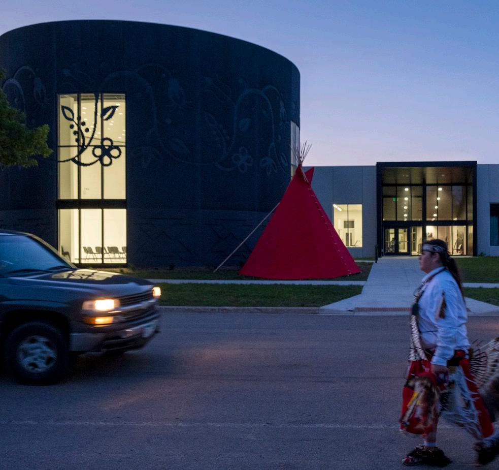 the precast and metal sunshades were influenced by traditional floral and geometric patterns found in the Dakota flag and language. Dentalium dresses inspired the colors and textures throughout the building. The circular shape of the shared community space within the building represents the 7 directions: cardinal directions, sky (through the oculus in the ceiling), ground, and the human soul as the center.