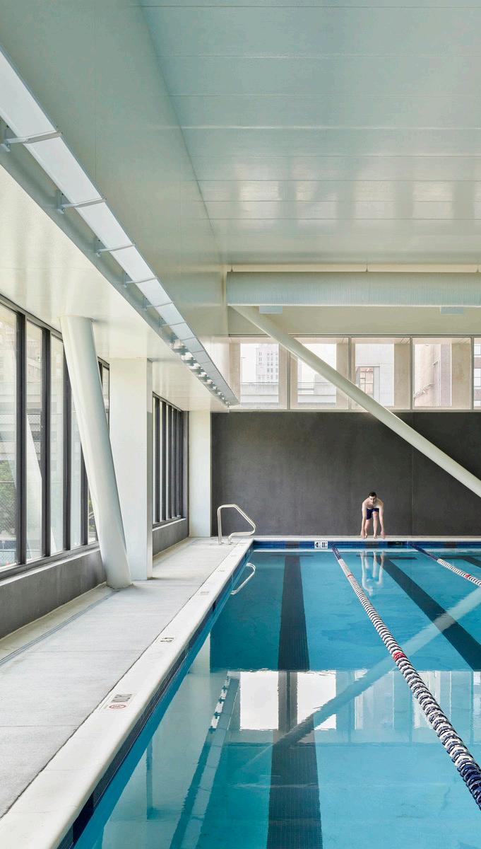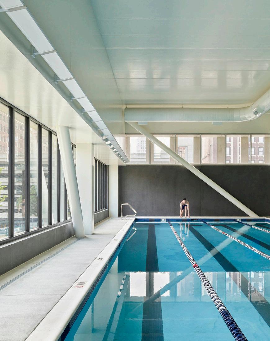 BNIM worked with the YMCA of Greater Kansas City to renovate and adaptively reuse a historic theatre in downtown Kansas City, Missouri, as the Kirk Family YMCA. Components include a gym for adult and youth sports programming; functional training areas for cardio and strength; group fitness studios, indoor track, basketball court; a four-lane practice lap pool and family aquatics pool; kids’ zone; and an outdoor sports field which is built atop the building’s stormwater detention facility that can store up to a 72-hour period of stormwater. In addition to these health and fitness amenities, the YMCA provides four community meeting rooms and a demonstration kitchen that create spaces for community meetings, training, classes, and the YMCA’s community support services. Our team also worked to support the relationship between the Kirk Family YMCA and its new community neighbor, Crossroads Charter Schools, creating opportunities for school programs.
