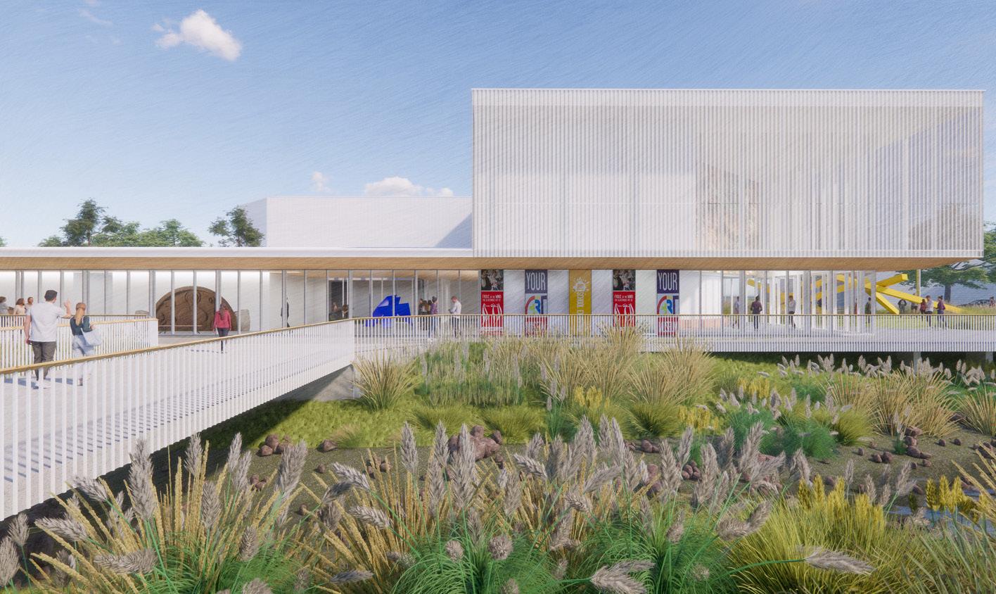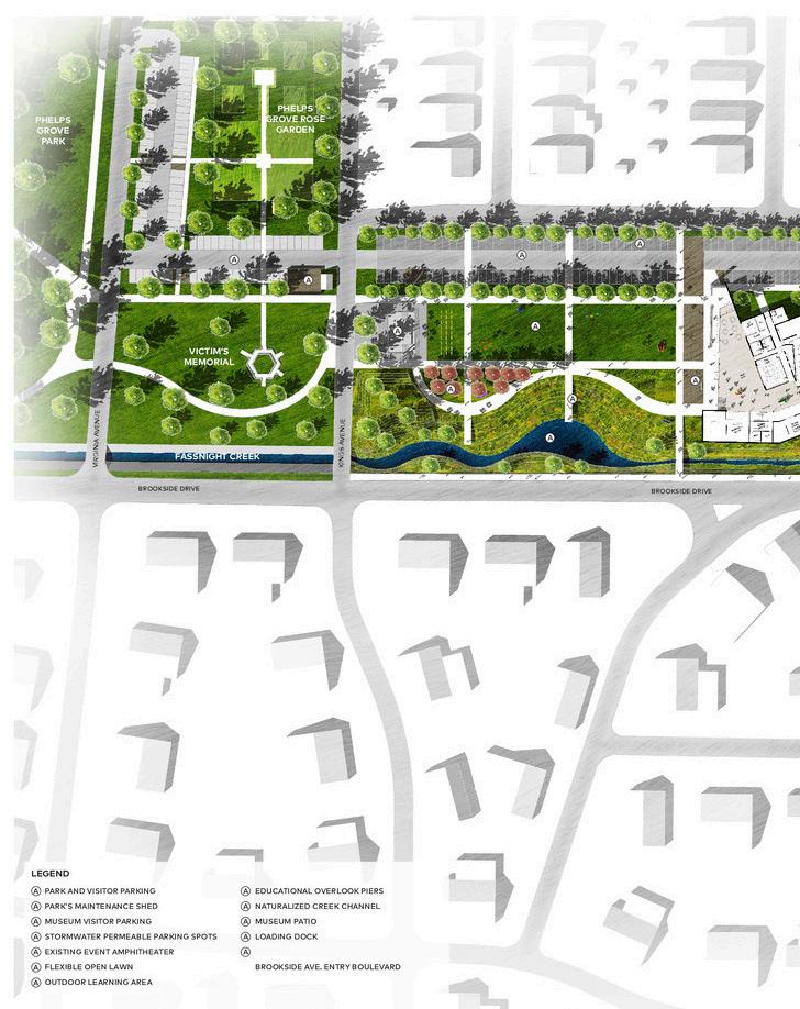 Integral to the project is the connection to Fassnight Creek and the native landscape, along with the history and heritage of Phelps Grove, dating back to George Edward Kessler’s work. The plan includes placing sculptures within the park landscape, activating the entire site and park with improvements to the amphitheater, and eliminating flood risks to the museum.