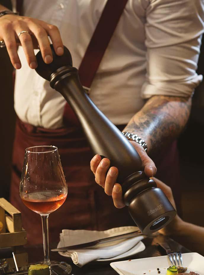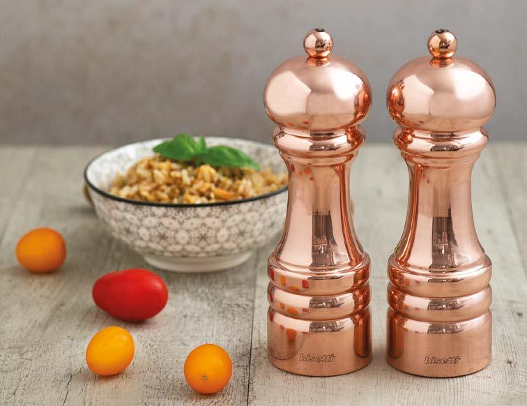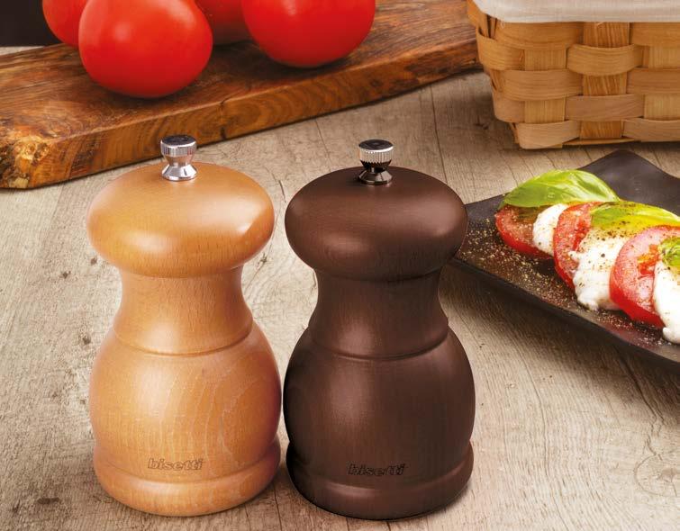 The mechanism of Bisetti’s pepper mill is made of hardened steel. The double row of rotor arranged teeth, holds and guides the peppercorns for a perfect grind. The zinc coating protects the grinding system from oxidation, ensuring the sharpening and wear resistance. All our mechanisms are guaranteed according to the EU and FDA food-industry regulations.