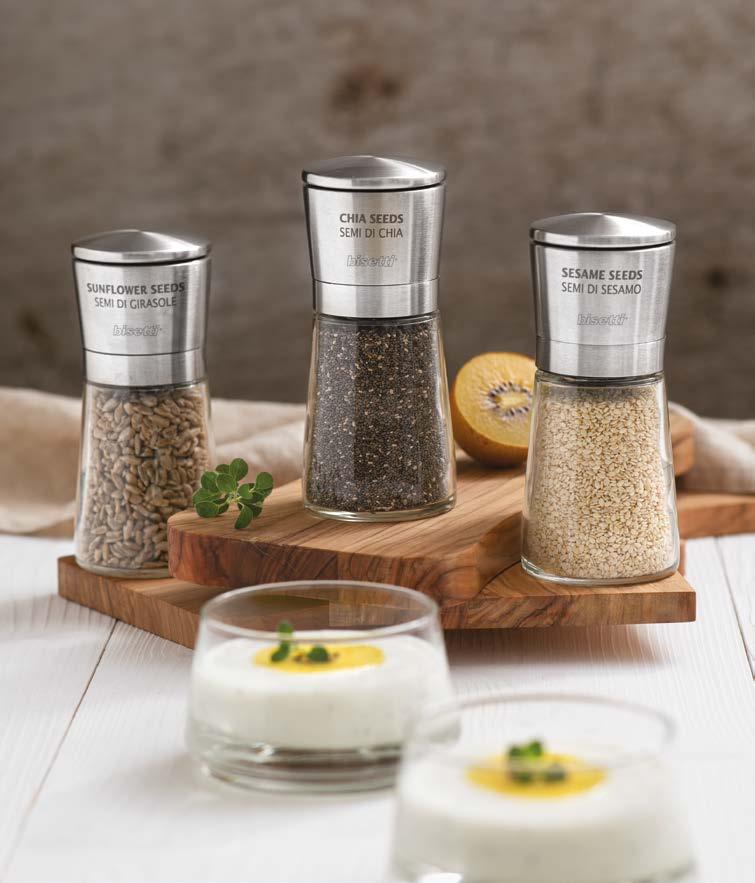 Il meccanismo dei macina spezie Bisetti è in Poliossimetilene, adatto alla macinazione di erbe aromatiche/spezie, in quanto alcuni tipi di questi prodotti secernono olio durante la macinazione trattenendo alcuni residui sul meccanismo. Essendo quest’ultimo in POM, i residui non vengono assorbiti come può succedere con altri meccanismi e basta un semplice lavaggio a mano per eliminarli. Il tutto garantito a norma UE e FDA per il contatto con gli alimenti.