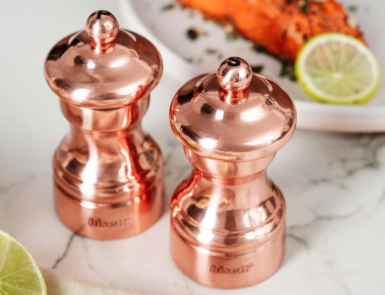 Il meccanismo dei macina pepe Bisetti è in acciaio temprato. La doppia fila della dentatura disposta a elica trattiene e guida i grani di pepe per una perfetta macinatura. Il rivestimento zincato protegge la macina dall’ossidazione, garantendo l’affilatura e la resistenza all’usura. Il tutto garantito a norma UE e FDA per il contatto con gli alimenti.