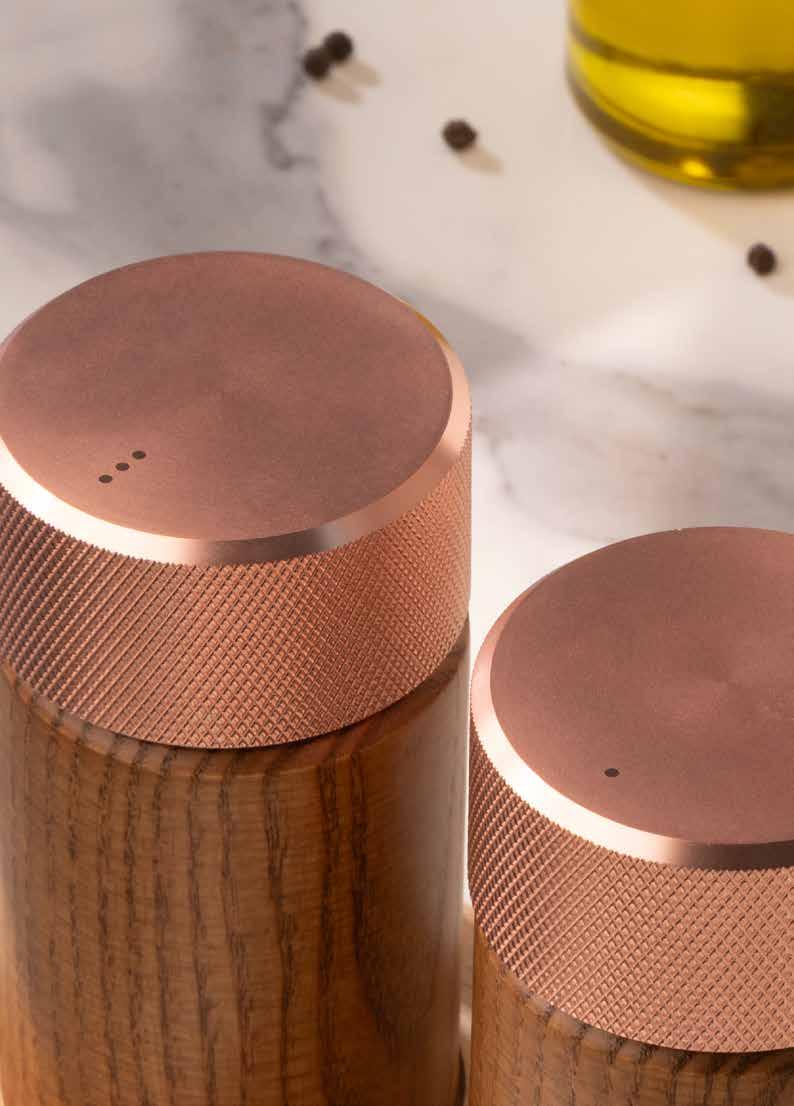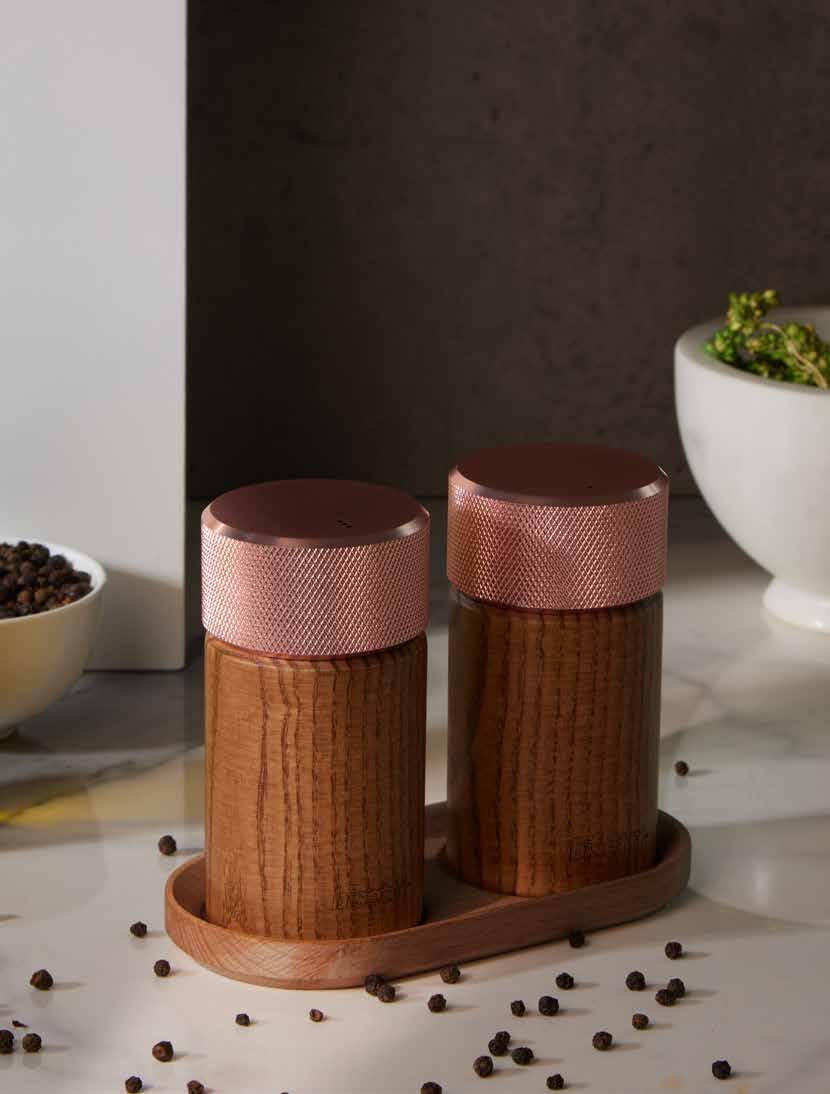 Set macina pepe + macina sale in frassino tinto noce con testa oro rosa Walnut stained ash wood pepper and salt mill set with golden rose head