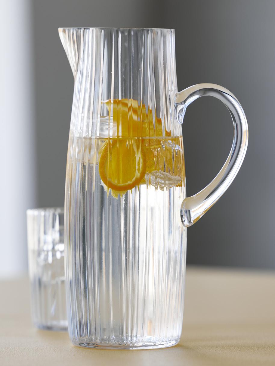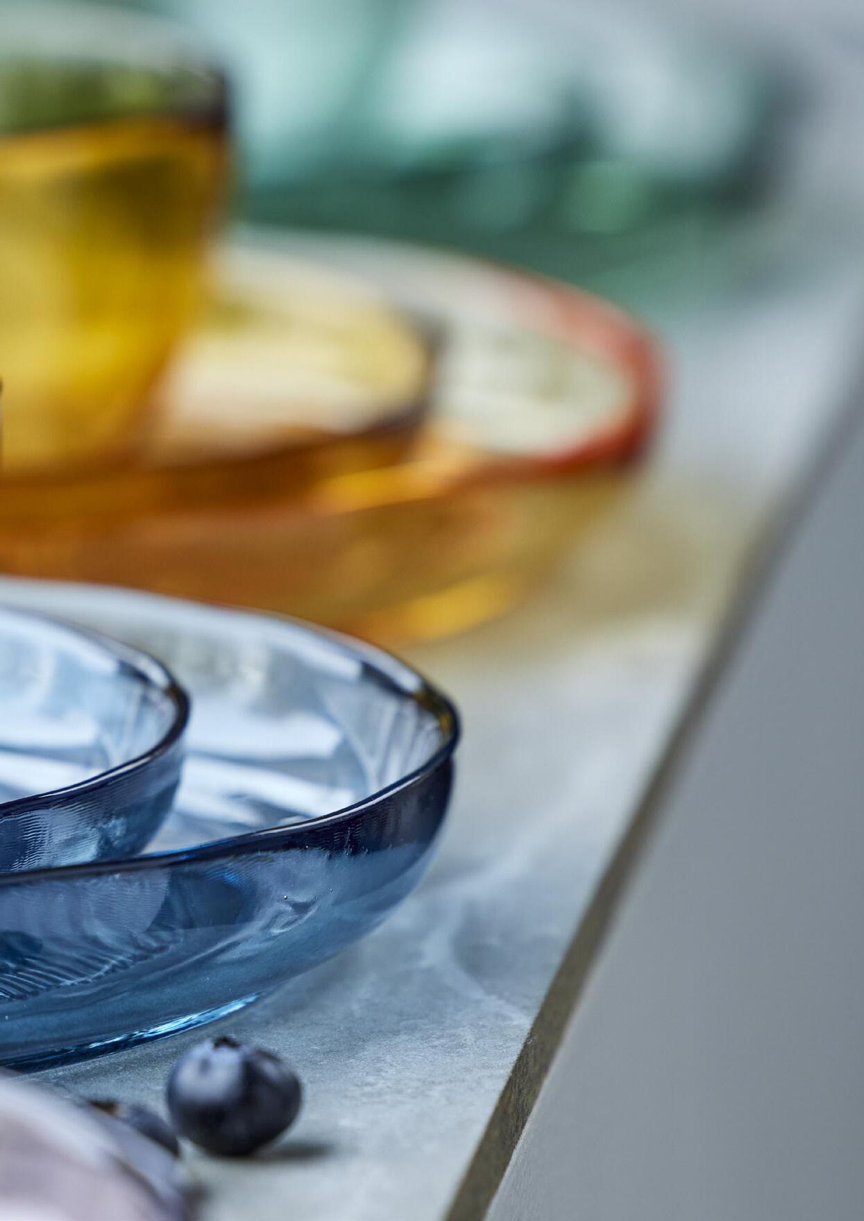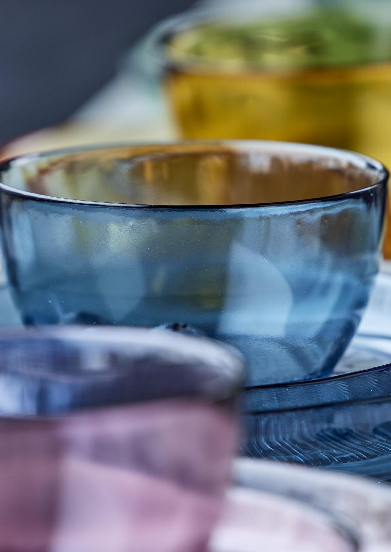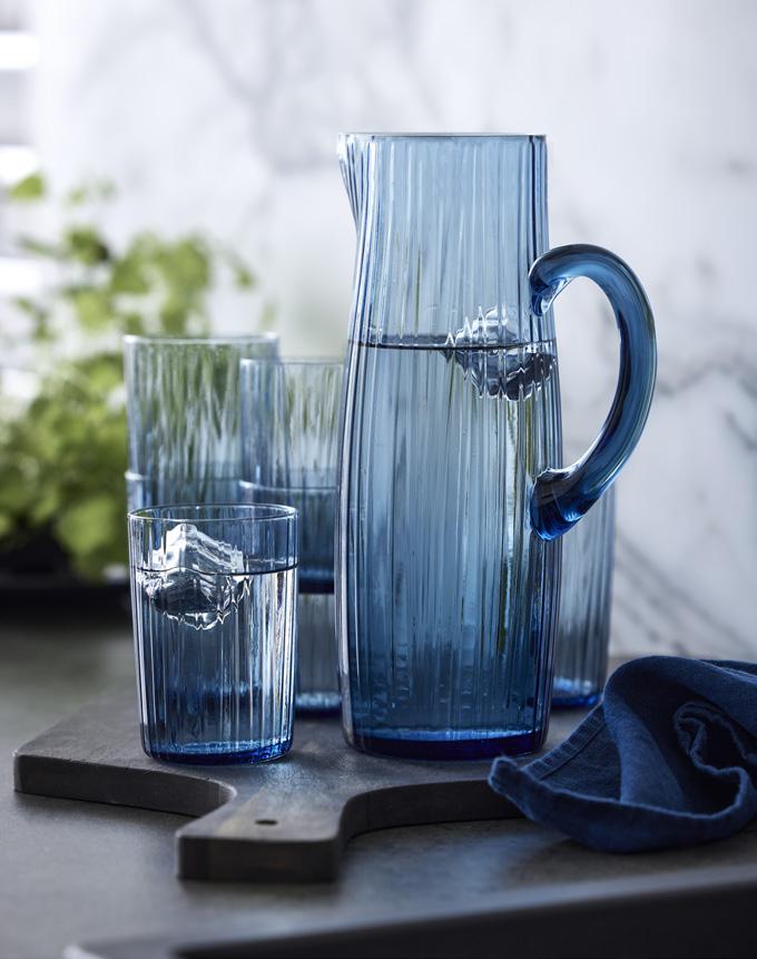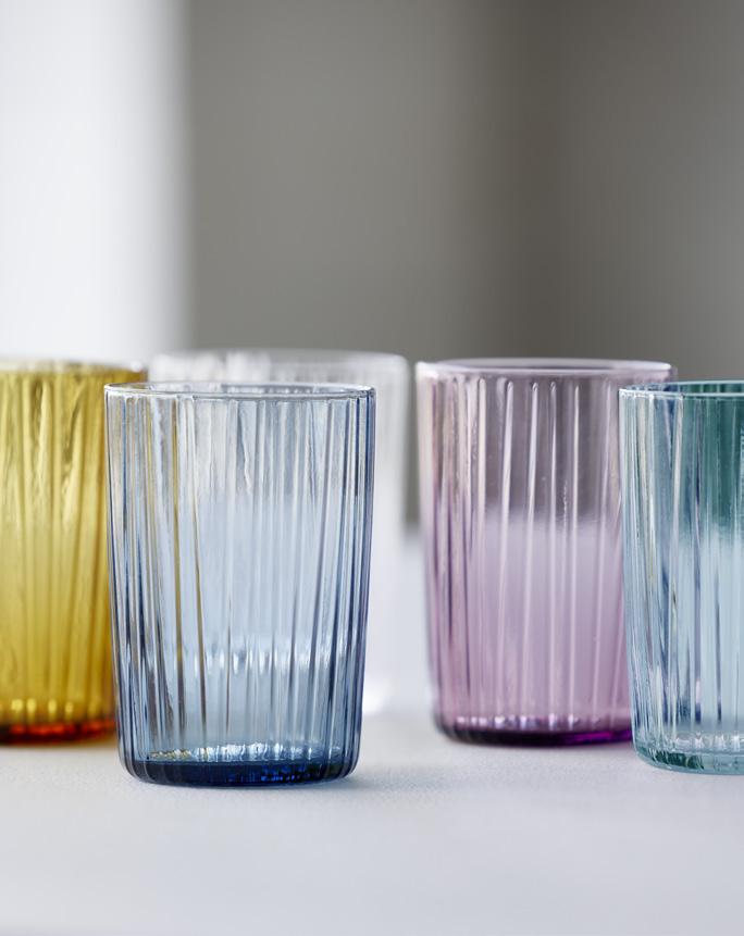 De flotte vandglas i gennemfarvet glas har det samme fine, riflede look som Kusintha-seriens kander og vandflasker. Glassene fås i grøn, amber, pink, blå og en helt klar udgave.