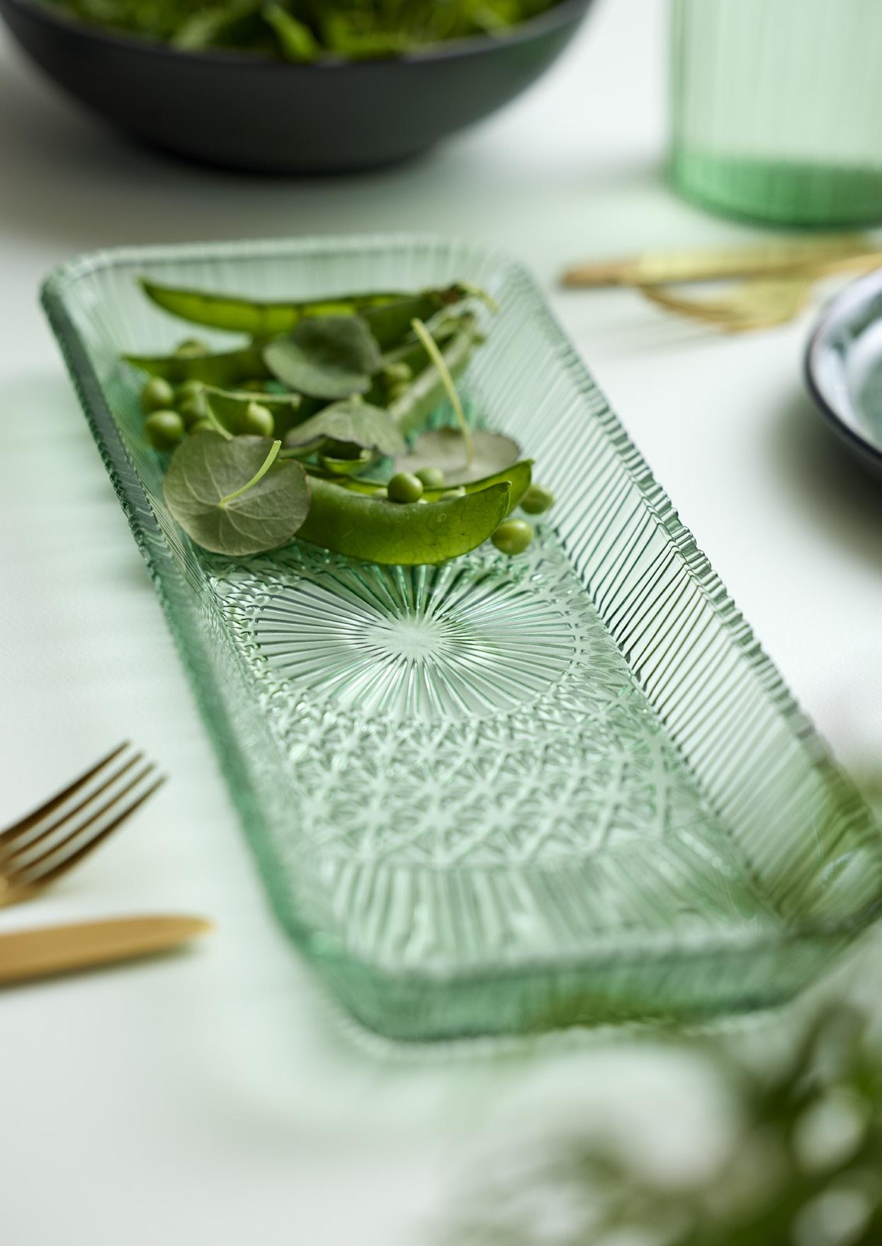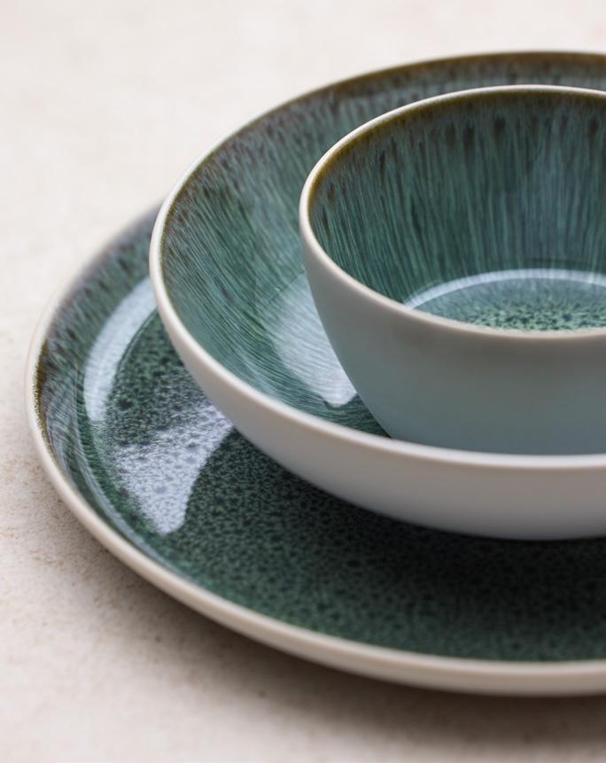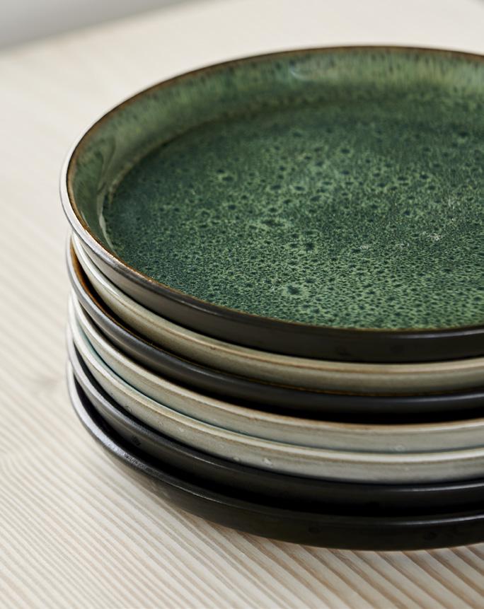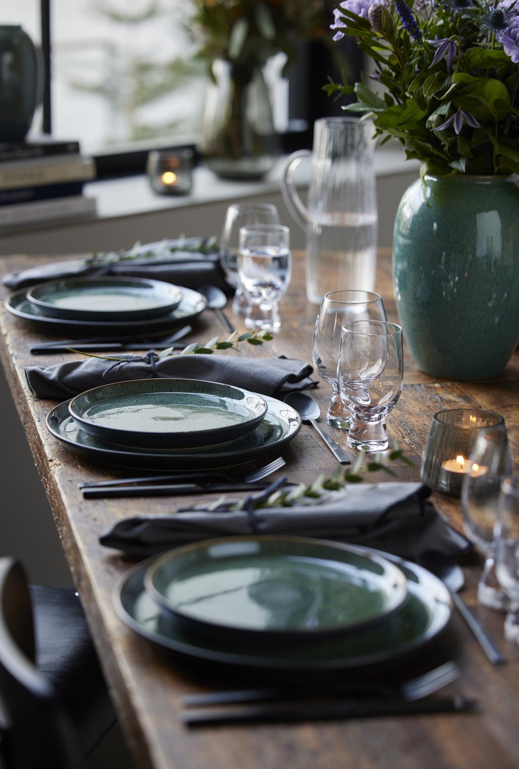 De skønne, grønne fade og tallerkener med den flotte blanke glasur glæder både syns- og smagssansen og klæder al den mad, du serverer.