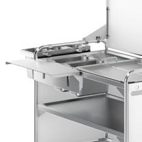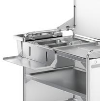 Mit dem Servierwagen als Basis ist die neue Abräumstation wie geschaffen fürs Abstellen, Sortieren und Rückführen von Tabletts, Geschirr und Besteck von bis zu 45 Gästen. Clevere Details und ein Sichtschutz mit Kennzeichnungs-Möglichkeit erhöhen die Effizienz.