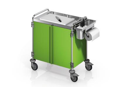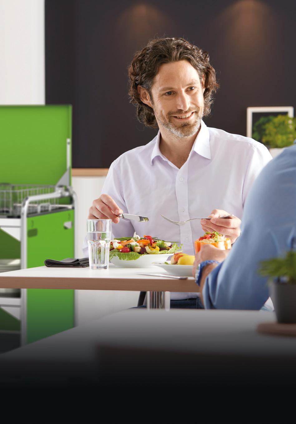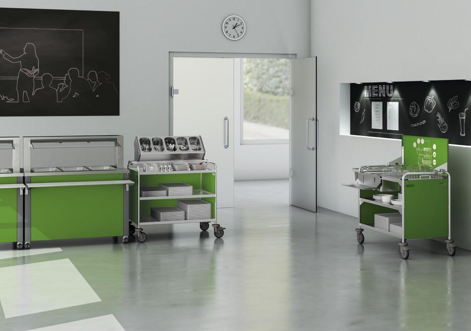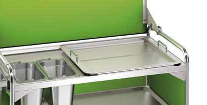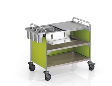 Wie geschaffen für die Selbstbedienung. In Schulen und Kindergärten ist das Mithelfen beim Abräumen ein Lernfaktor im Umgang mit Ressourcen. Mit der Abräumstation kann man übersichtlich Tabletts, Teller, Besteck und Gläser, aber auch Restmüll und Papier sortieren. Wendige Rollen erleichtern den Weg zurück in die Spülküche.