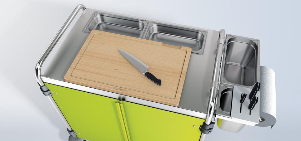 auf SW 8 x 5-3 mit Verkleidung und Türen in Granny, Kunststoffschneidbrett, Einhängerahmen mit drei GN 1/6-200 und Messerhalter