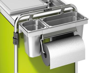 Noch mehr Ablagefläche erhalten Sie durch den Einhängerahmen. Er kann schnell und einfach ein- und abgehängt werden und bietet genug Platz für 3 GN 1/6. Griffbereit: Am Rahmen ist ein Bügel für die Küchenpapierrolle befestigt.