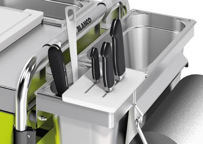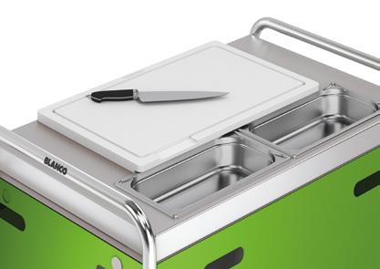 Arbeitsplatte zum Aufsetzen auf Servierwagen Herzstück ist die neue Arbeitsplatte aus Edelstahl. Sie passt perfekt auf nahezu jeden vorhandenen BLANCO Servierwagen 8 x 5. Eine spezielle Befestigung ist nicht notwendig und die Platte kann jederzeit wieder abgenommen werden. Sie enthält zwei Auschnitte zum Einsetzen von zwei GN 1/3-65 für den Transport von Schneidgut oder als Auffangbehälter.
