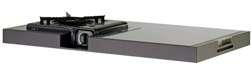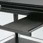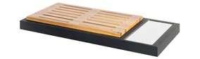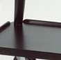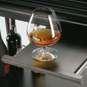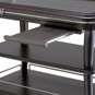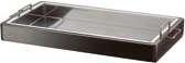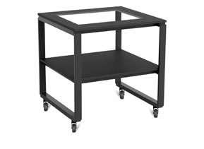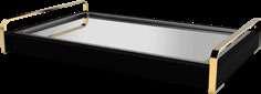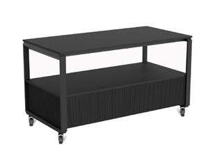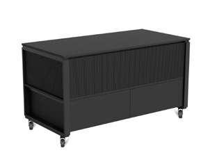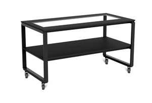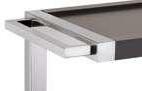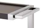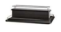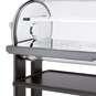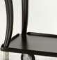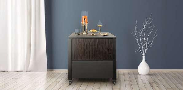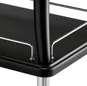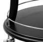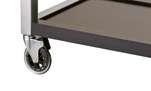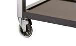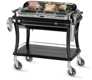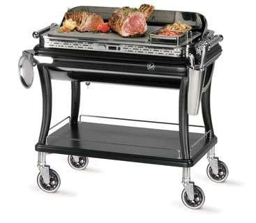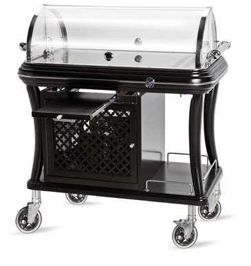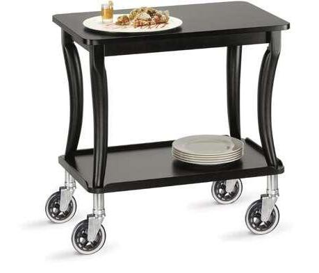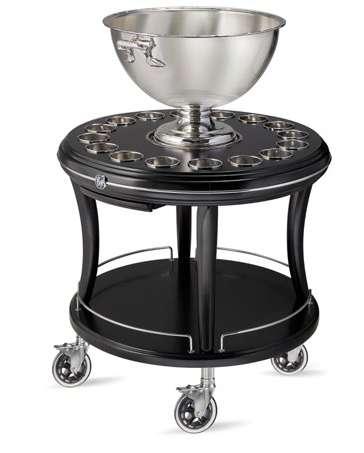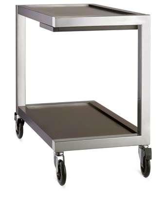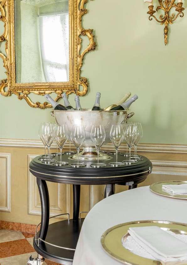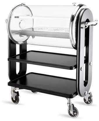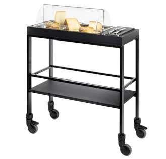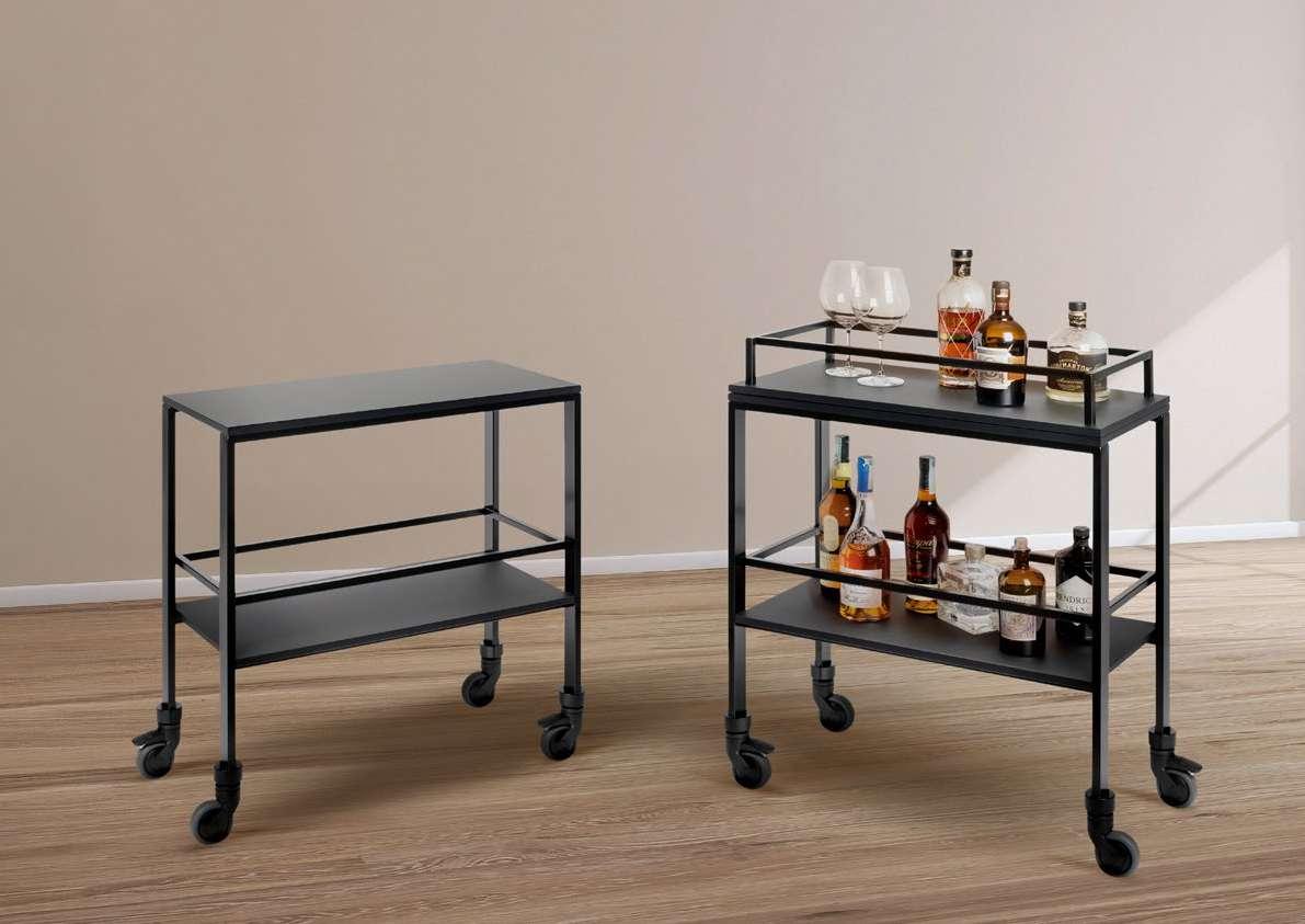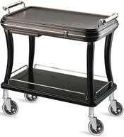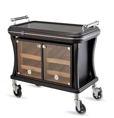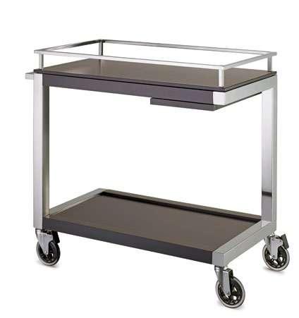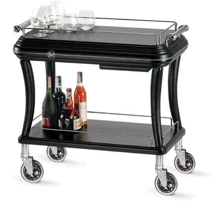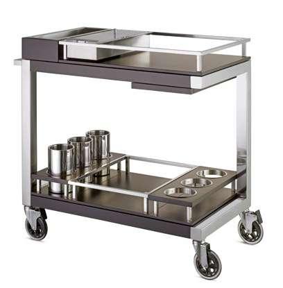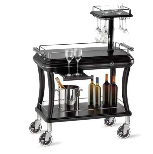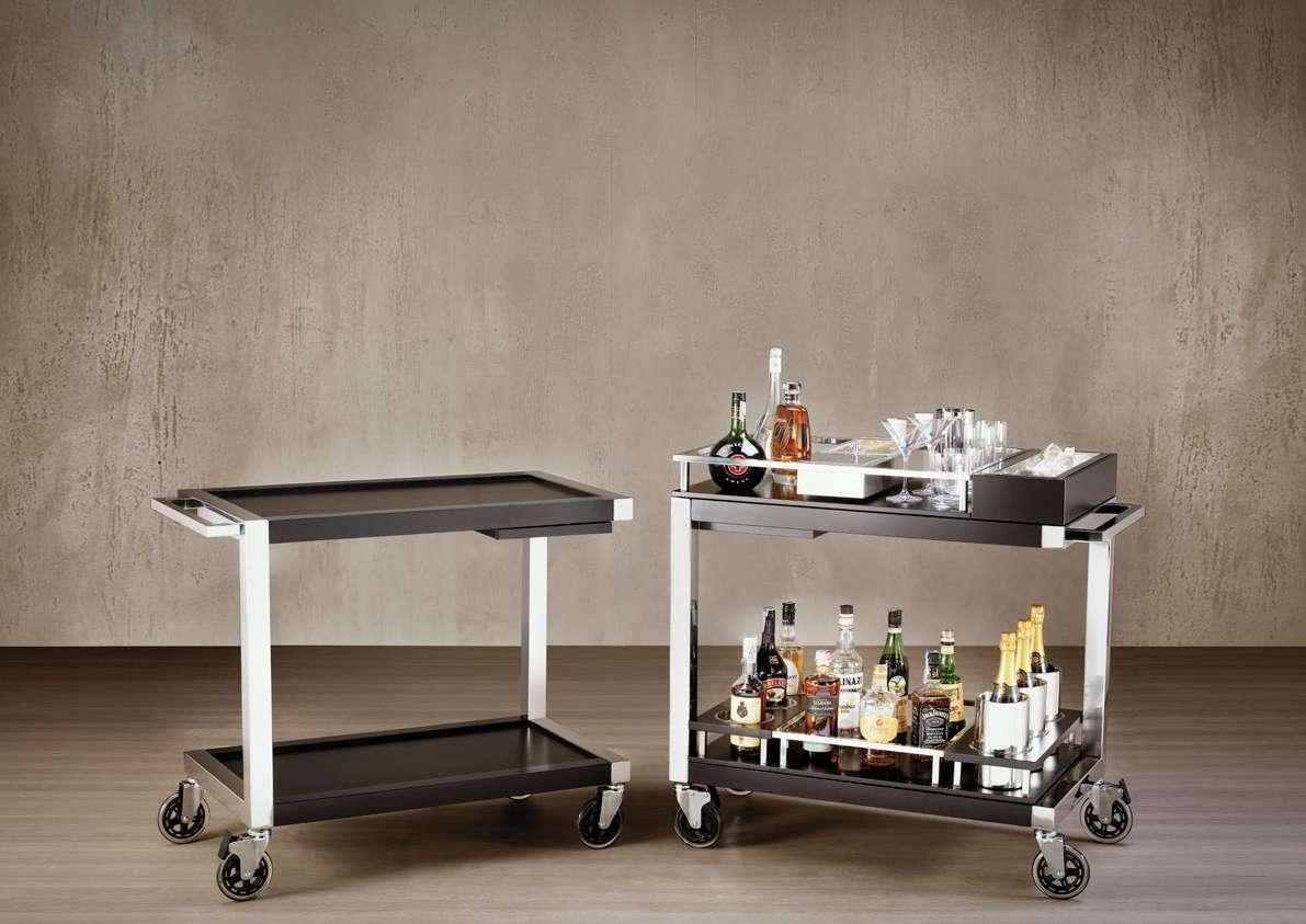 Carrello per il servizio al tavolo di liquori e digestivi. Il carrello è dotato di top in legno color ebano con finiture e accessori in acciaio inox lucidato a specchio.