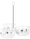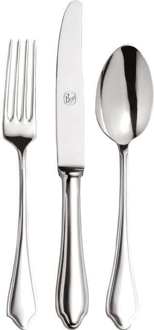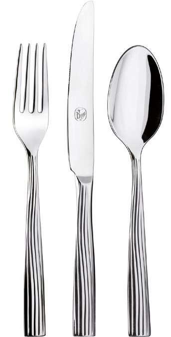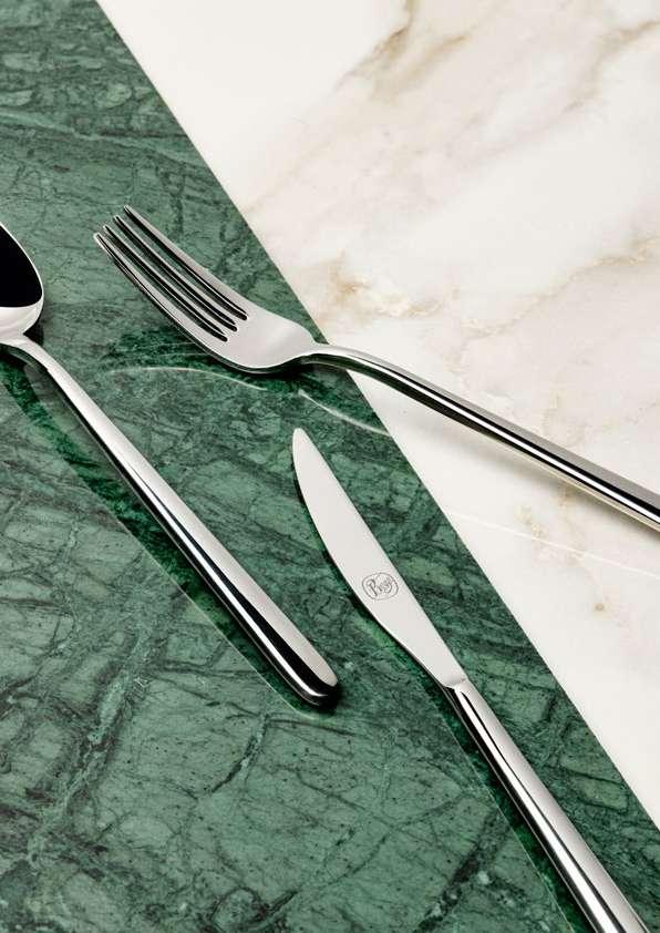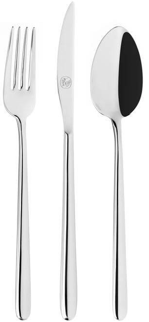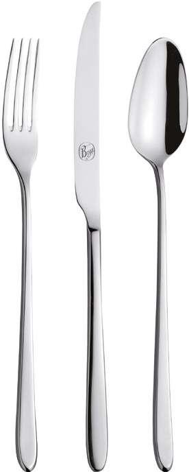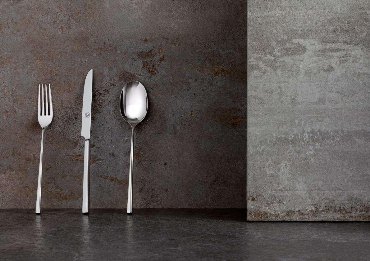 Die Kollektion geht auf eine Idee des Meisters zurück, die Design und Zweckmäßigkeit mit einem völlig neuen Element vereint: jedes Besteckteil ist für einen ganz besonderen Verwendungszweck bestimmt. Der Risottolöffel erleichtert das Servieren in Portionen und das gleichmäßige Verteilen von Einlagen/Saucen, die den Risotto anreichern. Der Löffel wird im raffinierten Set mit der Spaghettigabel präsentiert. Die praktische Greifzange ist für das bequeme Verkosten von Vorspeisen und frittierten Appetizern gedacht. Das Fleischset besteht aus der üblichen langen Gabel mit zwei Zinken und dem klassischen, wie ein Seziermesser gestaltetem Steakmesser zum perfekten Tranchieren des Filets. Das Fischmesser ist auch für Linkshänder gedacht und ermöglicht das einfache und mühelose Zerteilen des Fisches. Die Philosophie, die dieses Design inspiriert, steht im ‘Chopstick’ Zeichen: Griffe und Stiele verweisen auf die berühmte japanische Formgestaltung, während die Hohlflächen und Zinken in ihren Linien voll und ganz der reichen italienischen Tradition verbunden sind.