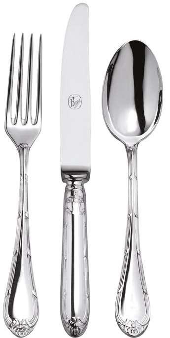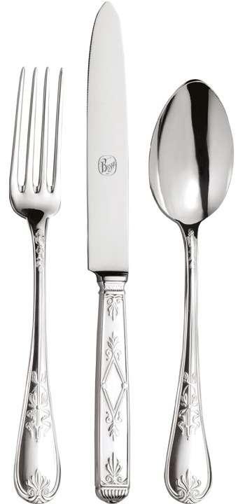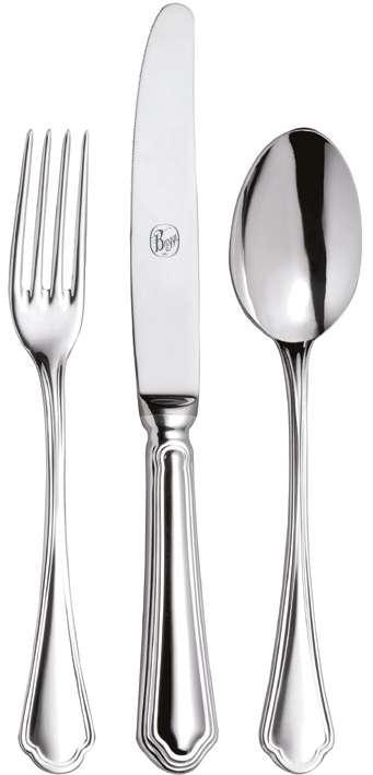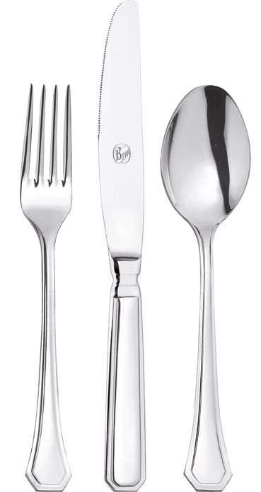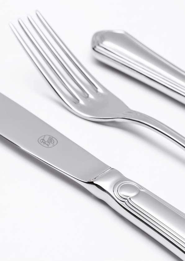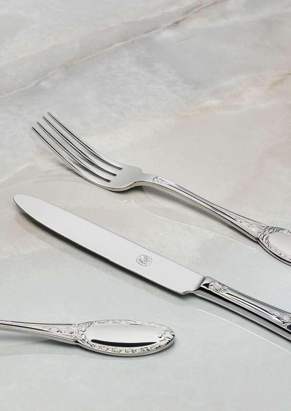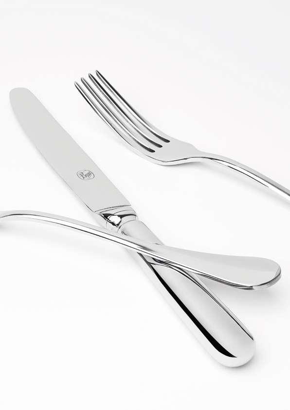 Wash the new products carefully before use. Use hot water to wash them and a good neutral detergent; then, rinse out with tepid water and dry all the items thoroughly. When washing, do not use chlorinated detergents nor products containing bleach. Pumice, steel wool, sponges or cloths saturated with abrasive powders must be strictly avoided. However, detergents without chloride containing fossil flour can be used. The washing of items after use is recommended. In case that would not be possible, it is however important not to leave for more than 12 hours the dirty items in contact with food leftovers (e.g.: if the items are used at lunch, they should be washed within the evening; if the items are used at dinner, they should be washed within the following morning). In case a prewash was needed, it must be carried out just before the washing and for a relatively short time. In fact, the items must not be soaked in the washing solution for too long, since some substances contained in food are damaging for the electroplating and change its appearance. Knives blades are manufactured with a valuable stainless steel and are sensitive to the corrosion attacks developed by acetic, citric and lactic acid and in particular to sodium chloride present in food.