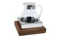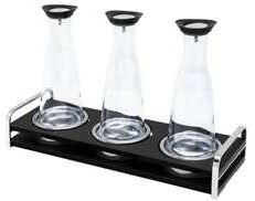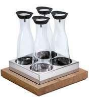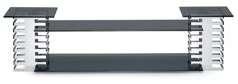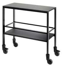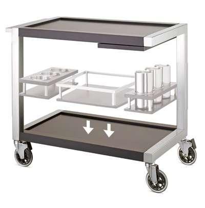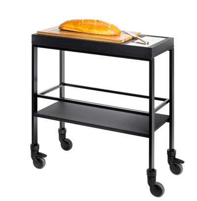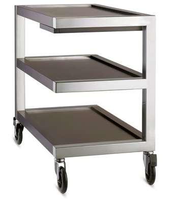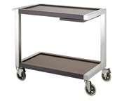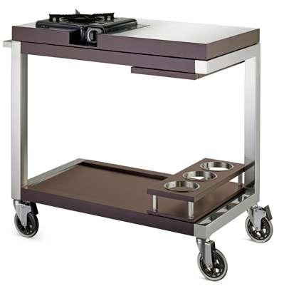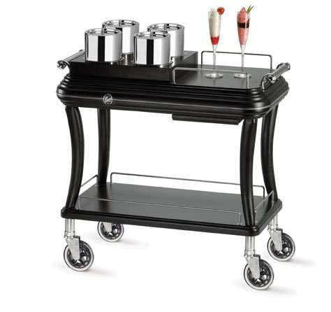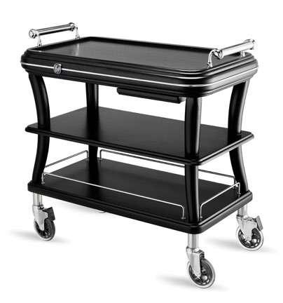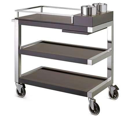 Service trolley for liquor and digestives. The trolley is provided with ebony colour wooden top, mirror-polished stainless steel finishing and accessories.