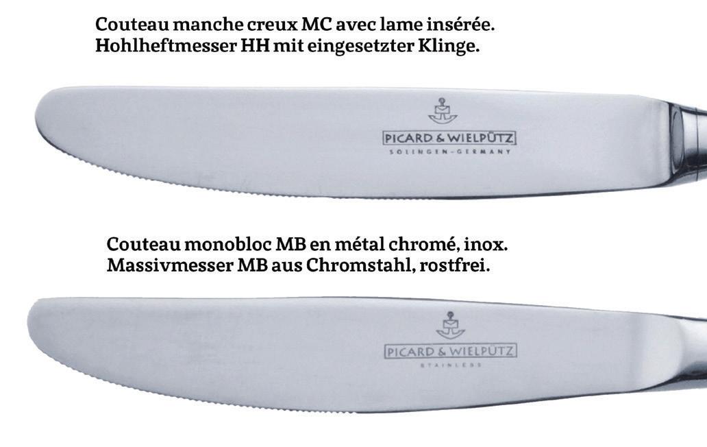 Ils combinent un manche massif en acier 18/10 et une lame 13/0 qui leur est soudée. Ils sont disponibles sur quelques modèles de Picard & Wielpütz exclusivement. Ils sont d’un poids proche des couteaux monoblocs, mais plus chers. Leur entretien est similaire aux couteaux monocoques.
