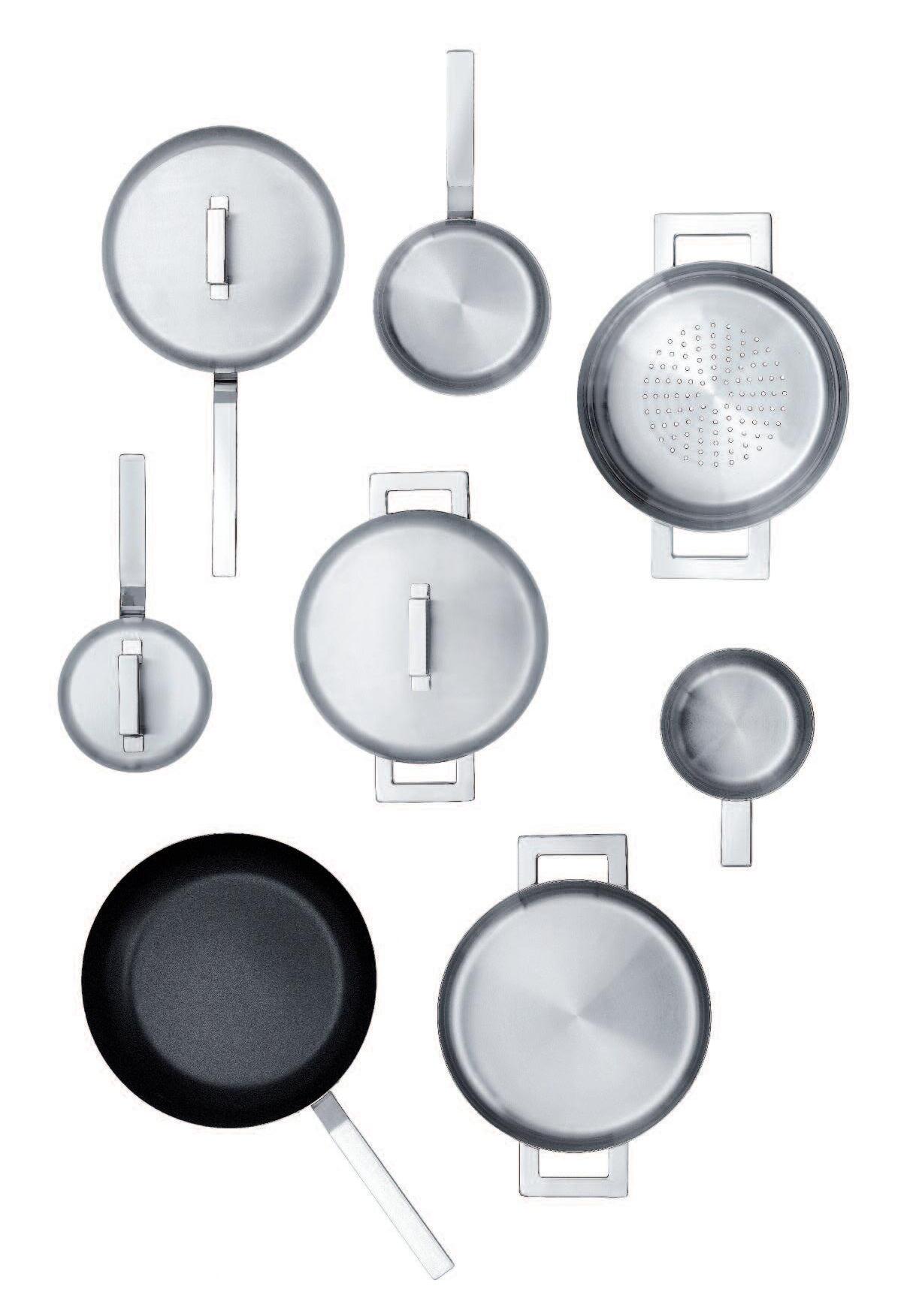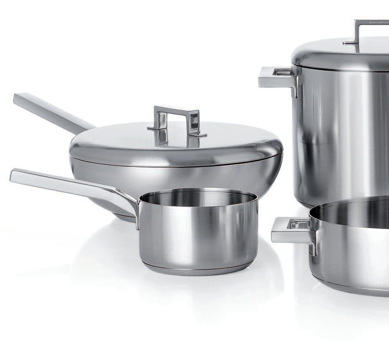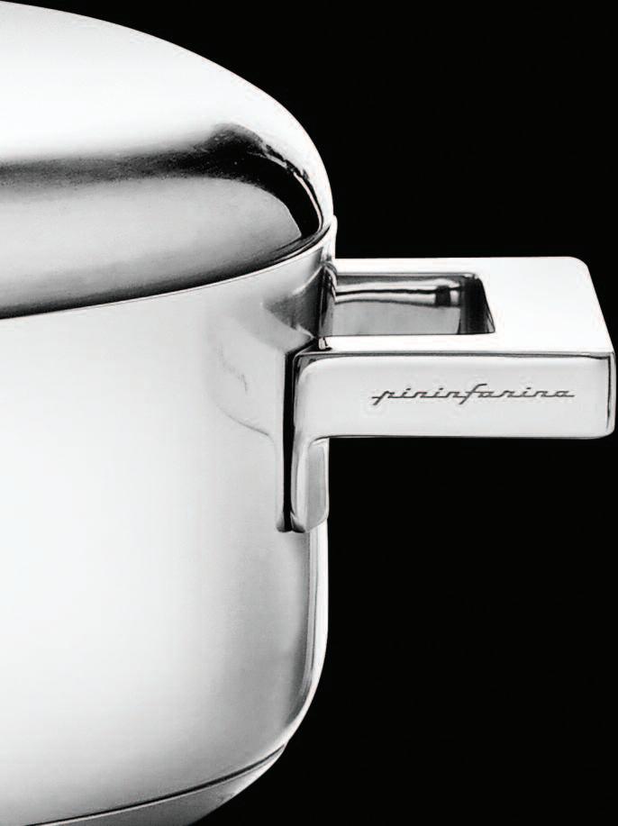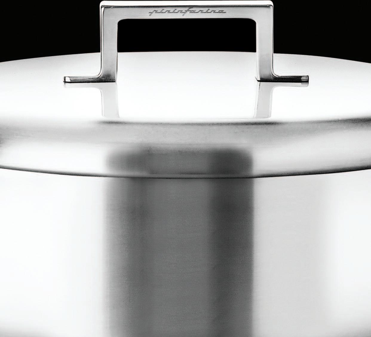 La purezza delle linee e le geometrie pulite danno forma a una collezione in cui stile e funzione raggiungono l’equilibrio perfetto. Il coperchio, dalle linee arrotondate, richiama la forma della pentola, garantendo una perfetta integrazione degli elementi, quasi a suggerire l’idea di un corpo unico ed estremamente compatto Il contrasto tra la finitura satinata esterna e quella lucida dei manici, conferisce alla collezione un aspetto inconfondibile