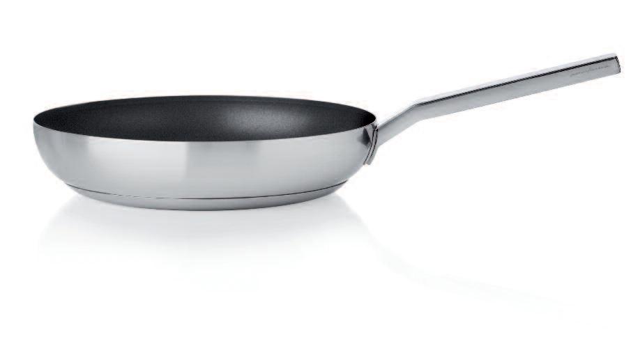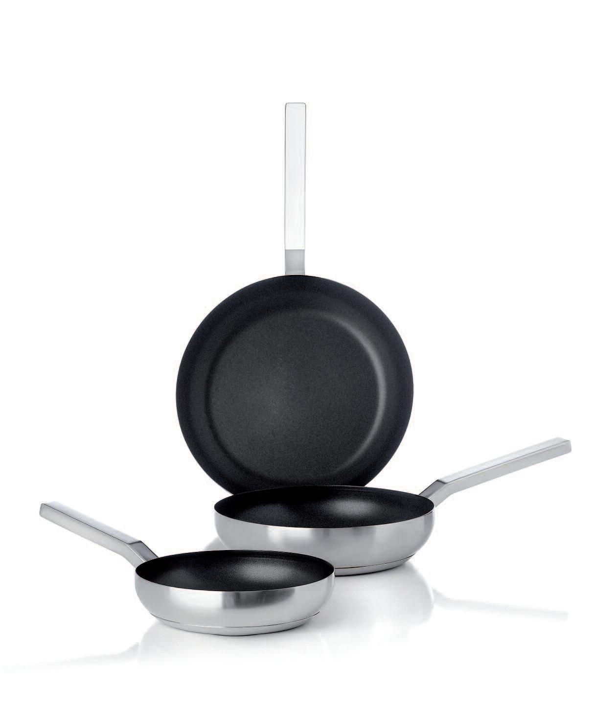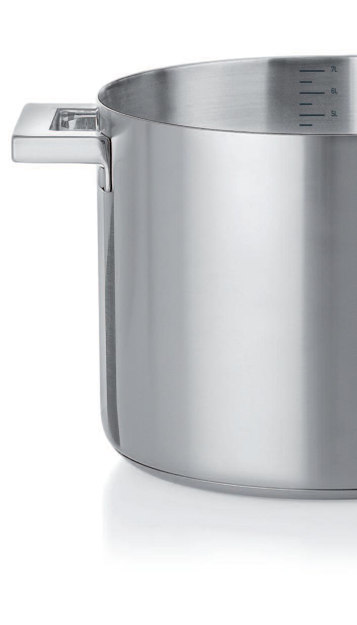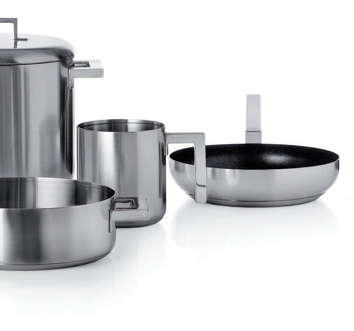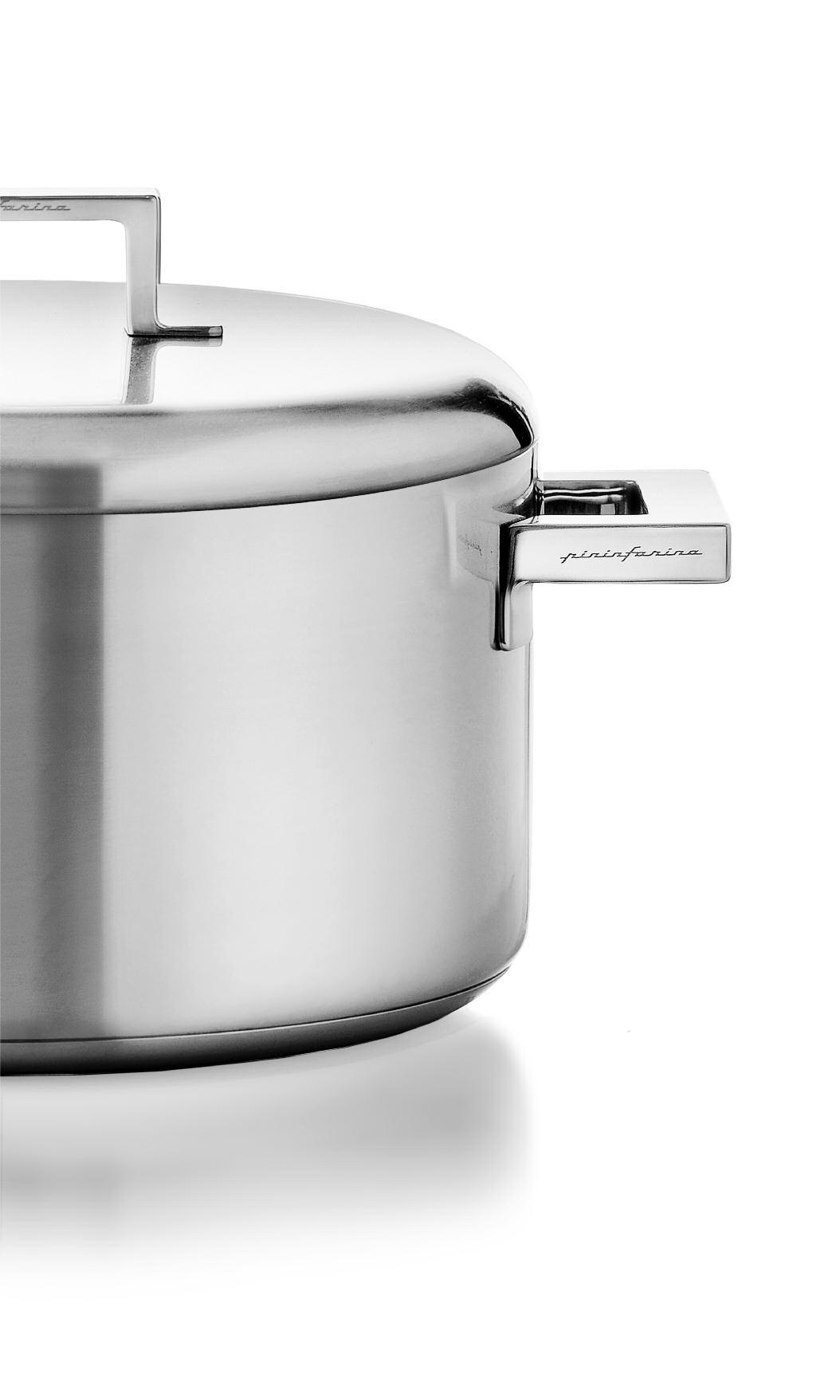 La purezza delle linee e le geometrie pulite danno forma a una collezione in cui stile e funzione raggiungono l’equilibrio perfetto. Il coperchio, dalle linee arrotondate, richiama la forma della pentola, garantendo una perfetta integrazione degli elementi, quasi a suggerire l’idea di un corpo unico ed estremamente compatto Il contrasto tra la finitura satinata esterna e quella lucida dei manici, conferisce alla collezione un aspetto inconfondibile