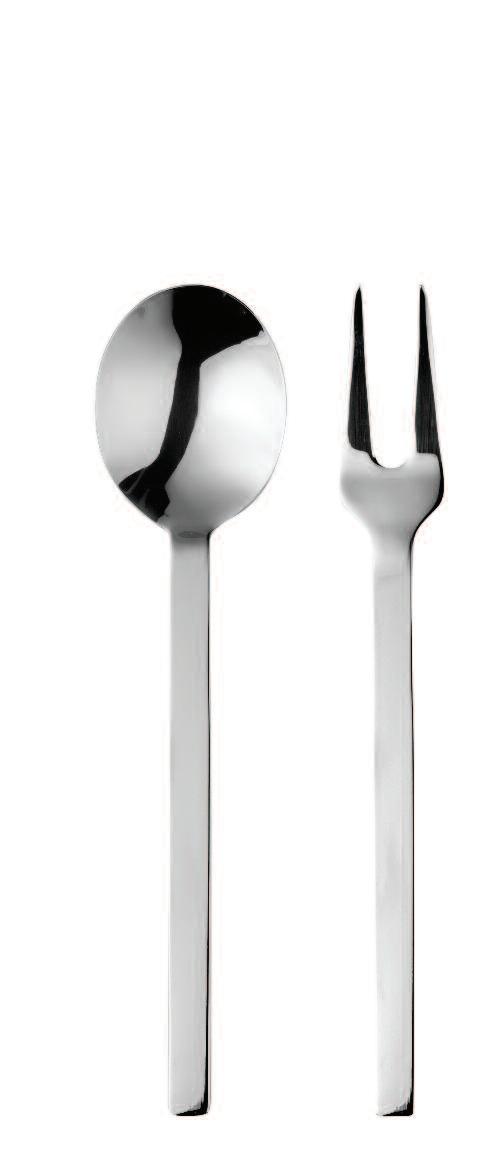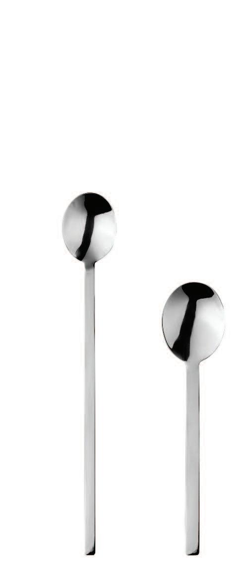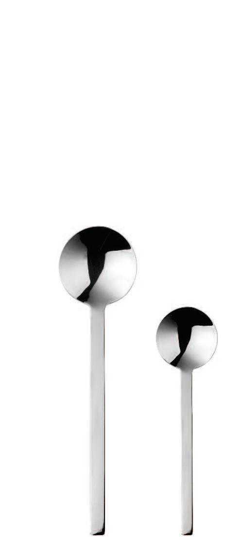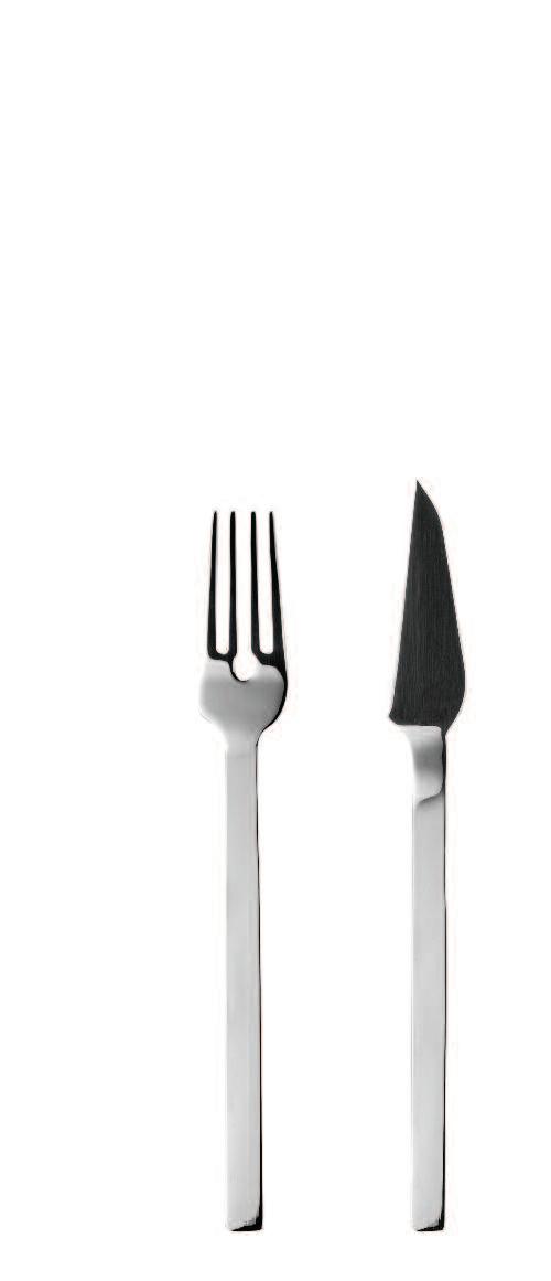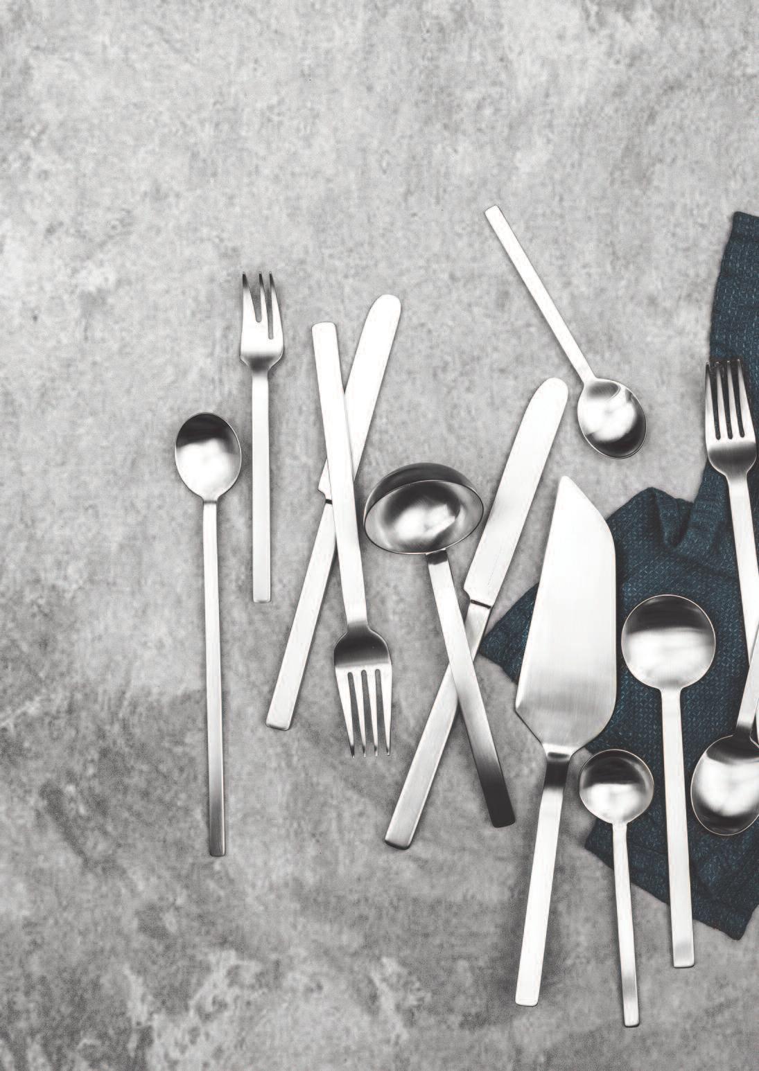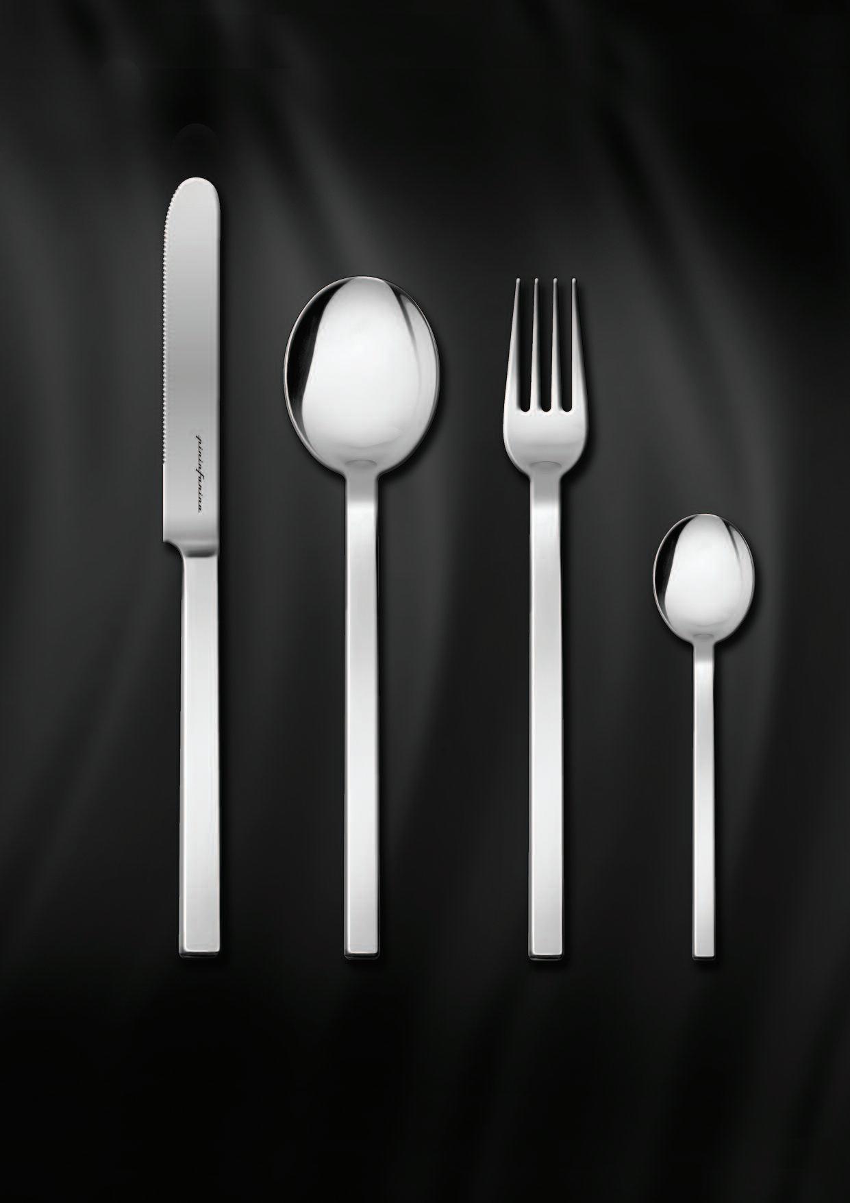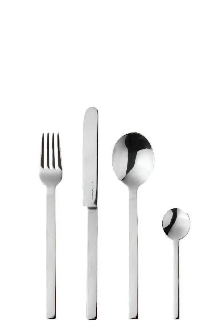 La elegancia de un cubierto se mide cuando las formas de la cuchara, del tenedor, del cuchillo y de la cuchara café se fusionan armoniosamente en el respeto de las dimensiones creando la perfecta armonía en la mesa donde las piezas viven y trabajan juntas