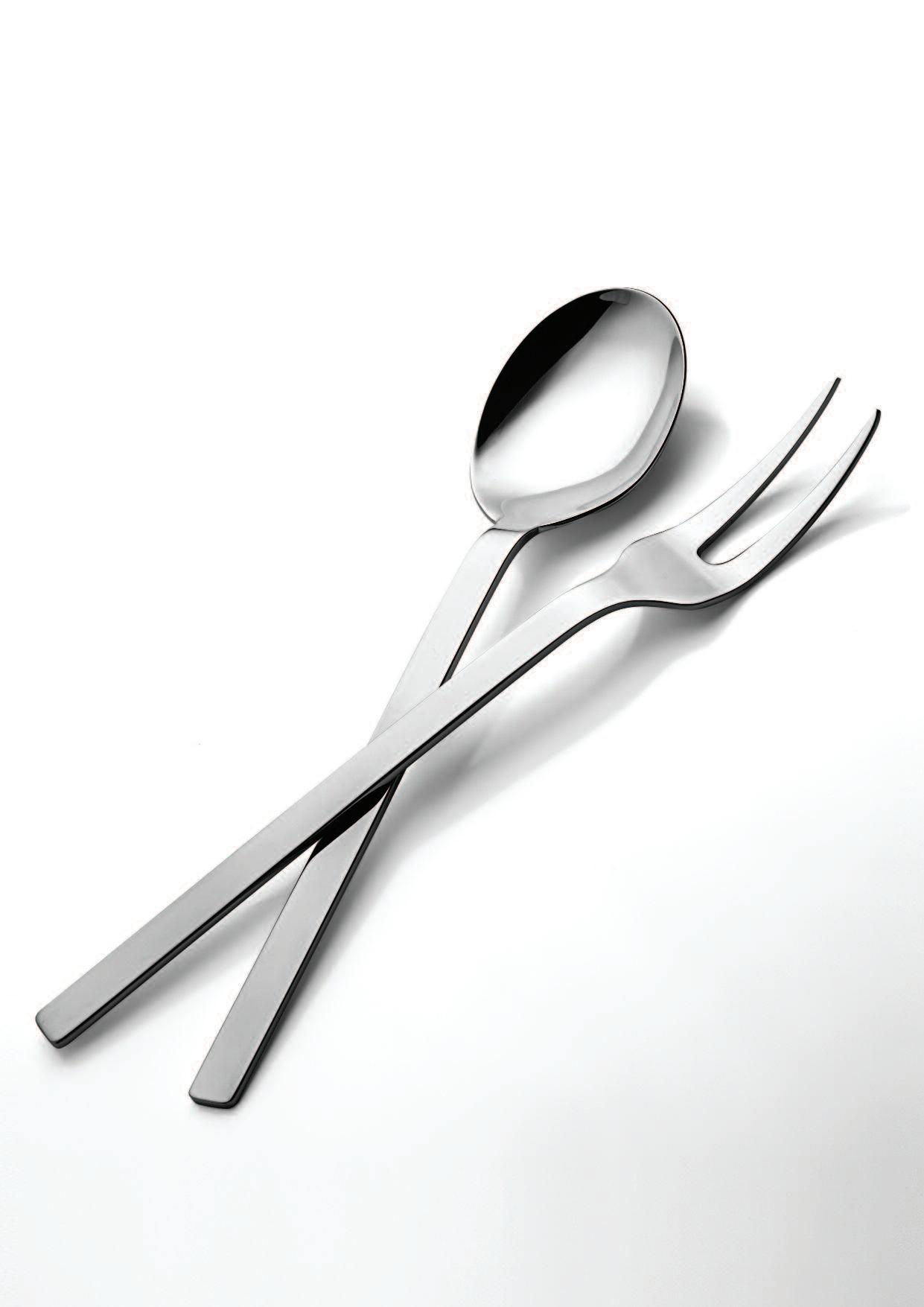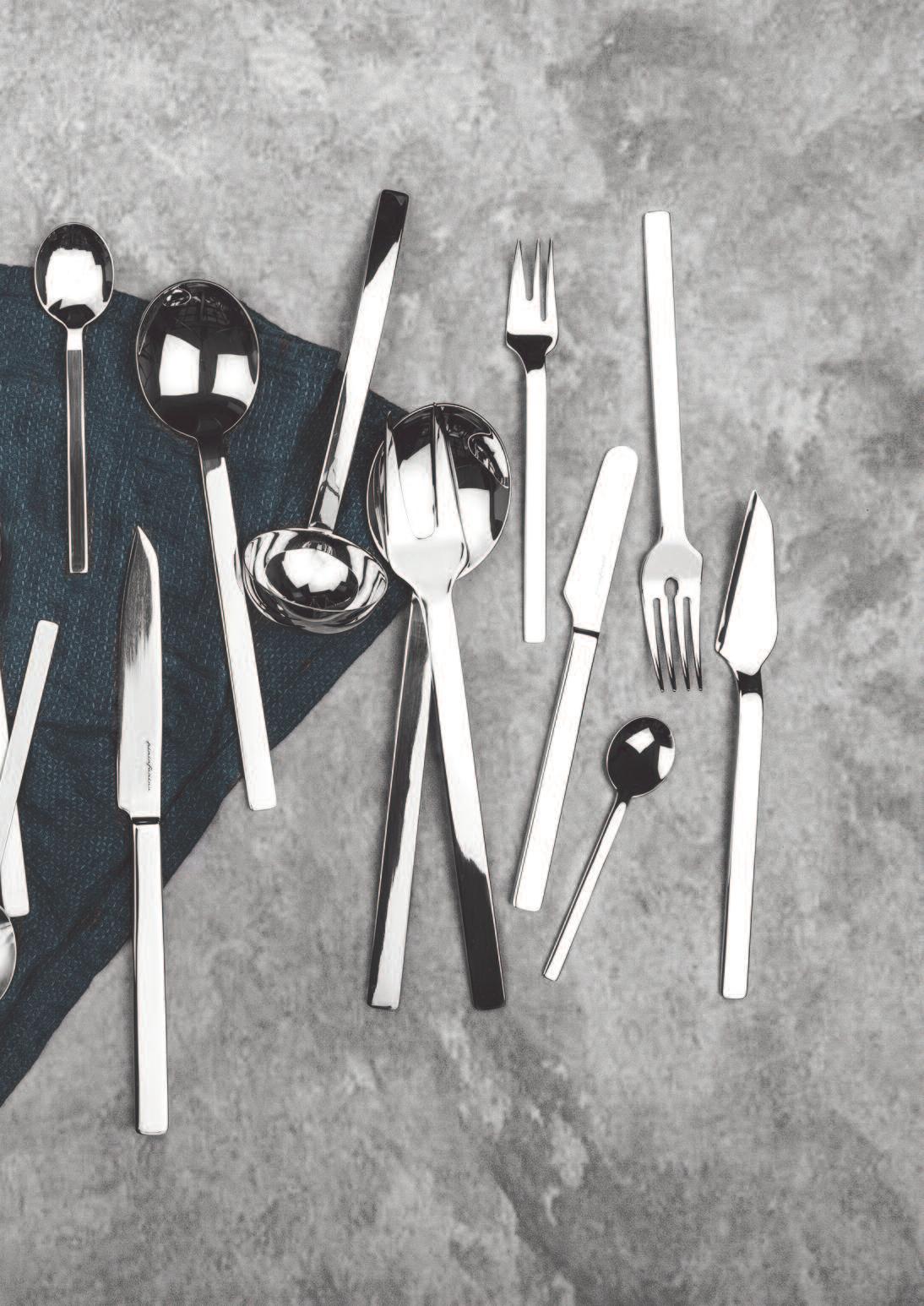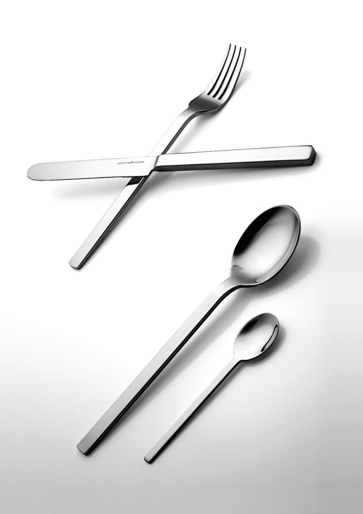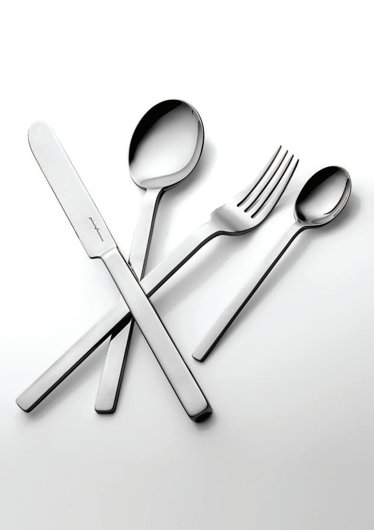 L'eleganza della posata si misura quando le forme del cucchiaio, la forchetta, il coltello ed il cucchiaino si fondono armoniosamente, nel rispetto delle dimensioni, creando la perfetta armonia sulla tavola, dove ogni pezzo vive e lavora insieme