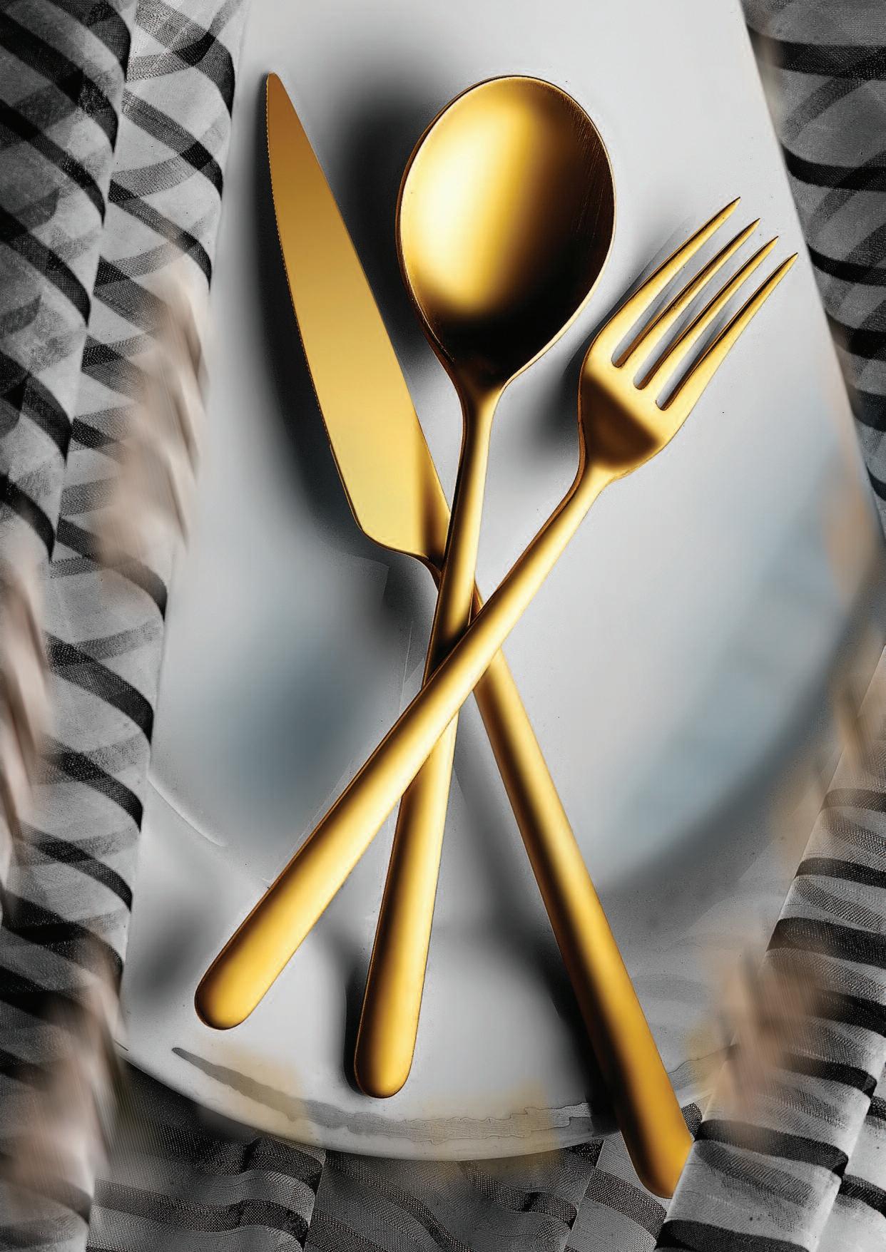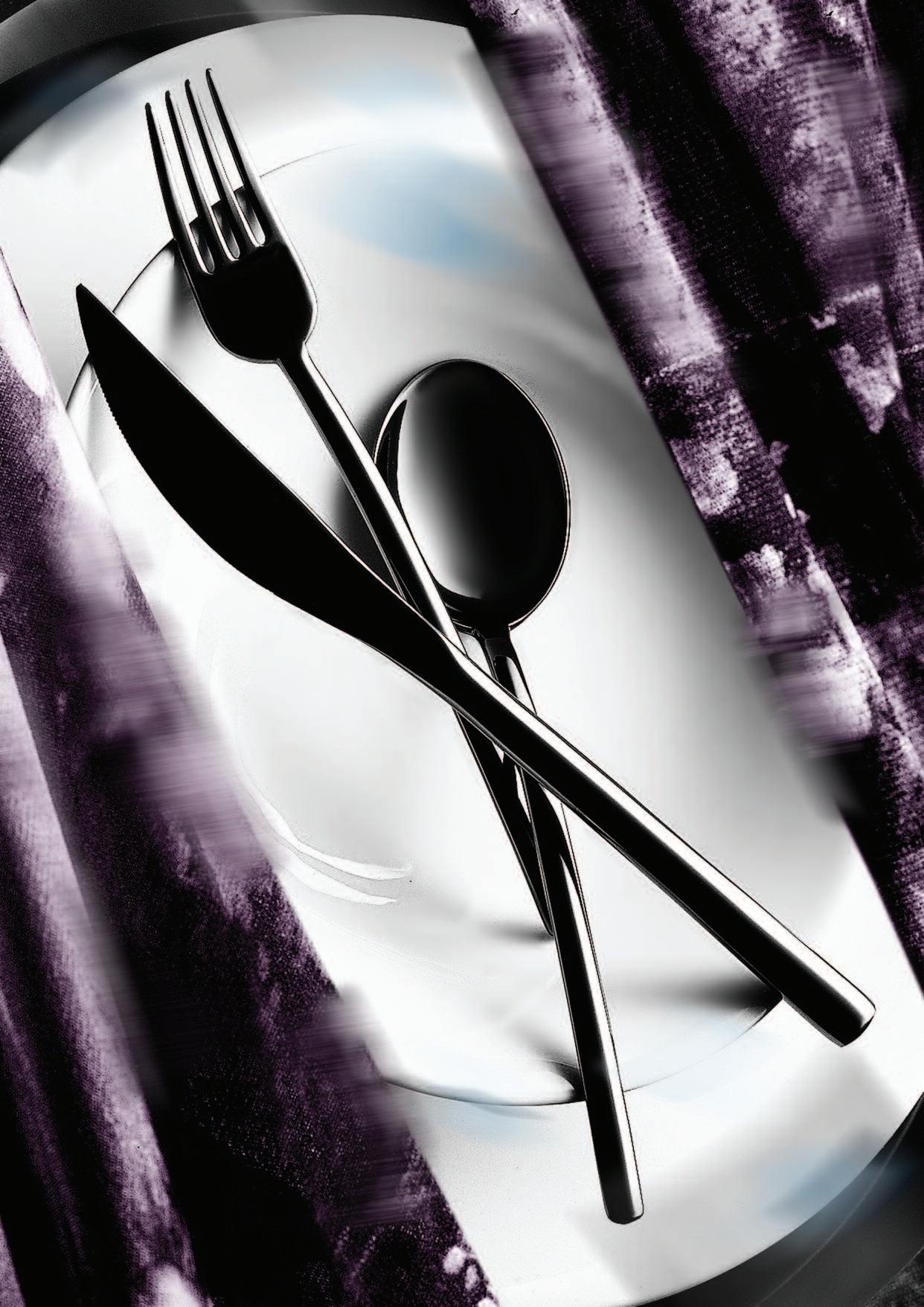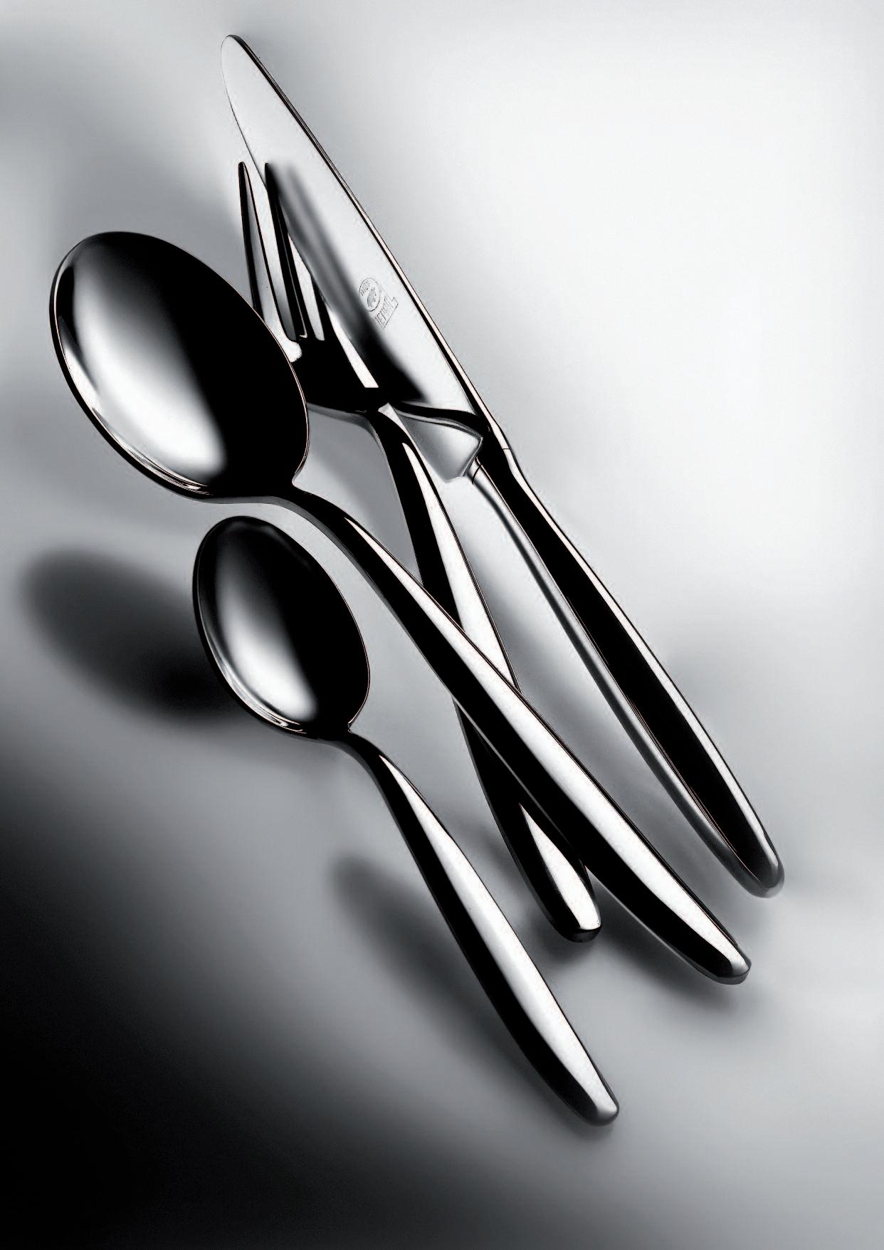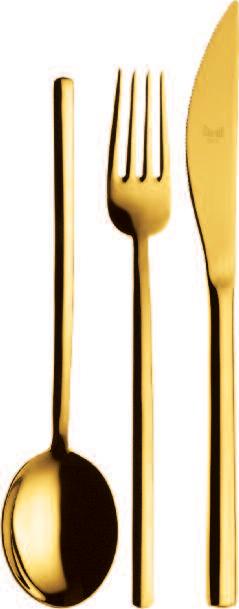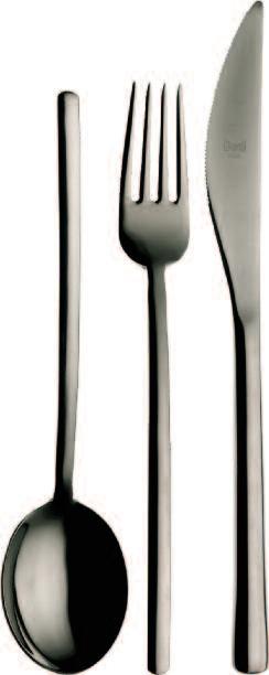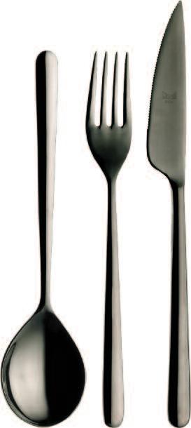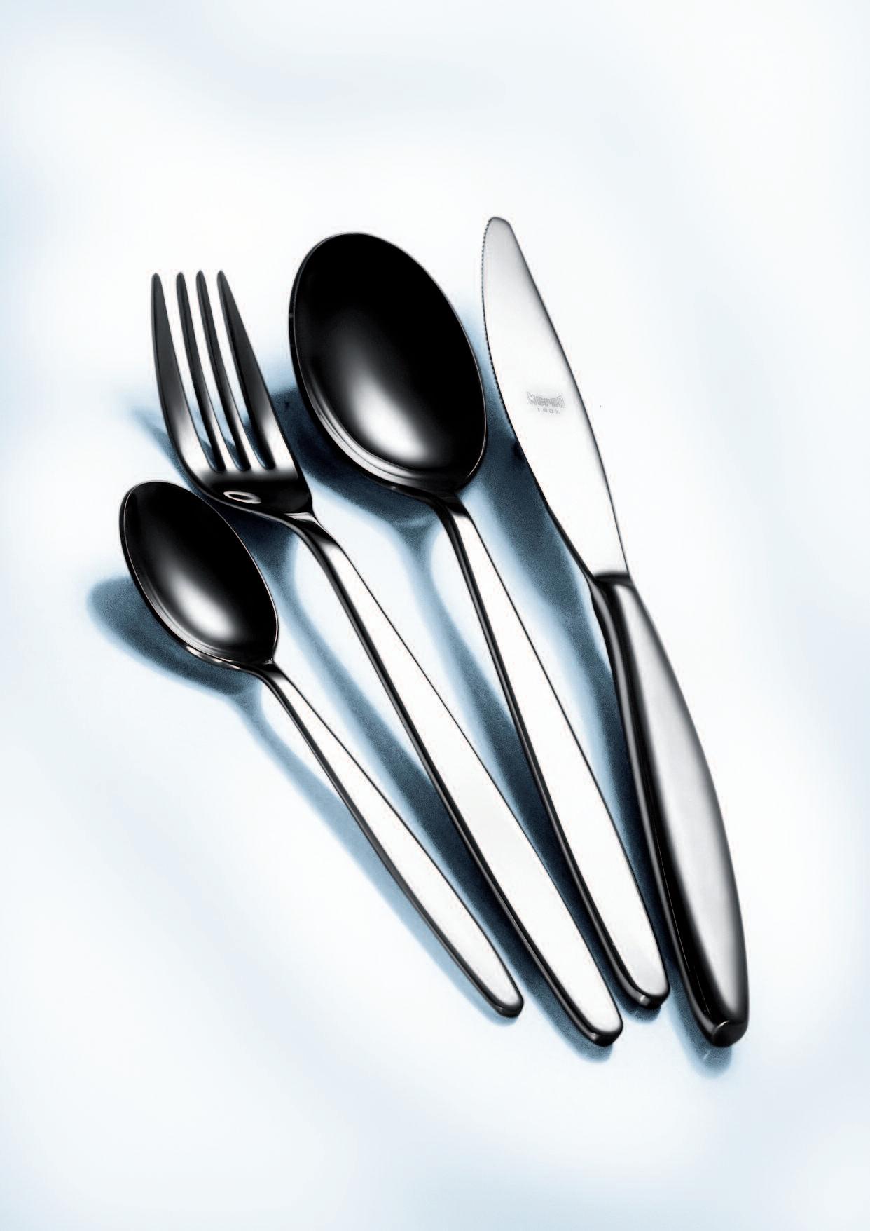 Die hier und vorher abgebildeten Bestecke, die mit einer Oberfläche aus Titan versehen sind, haben exakt die Farbe von Gold(ORO ICE), tiefem Schwarz (ORO NERO) und Bronze (BRONZO), was der Gestaltung von Tischen und Wohnräumen völlig neueAkzente verleiht Das angewendete Veredelungsverfahren (P V D ) kommt aus der Raumfahrttechnik und war bisher bei der Gestaltung von Tabletop-Artikeln noch nie nicht angewendet worden bzw völlig unbekannt