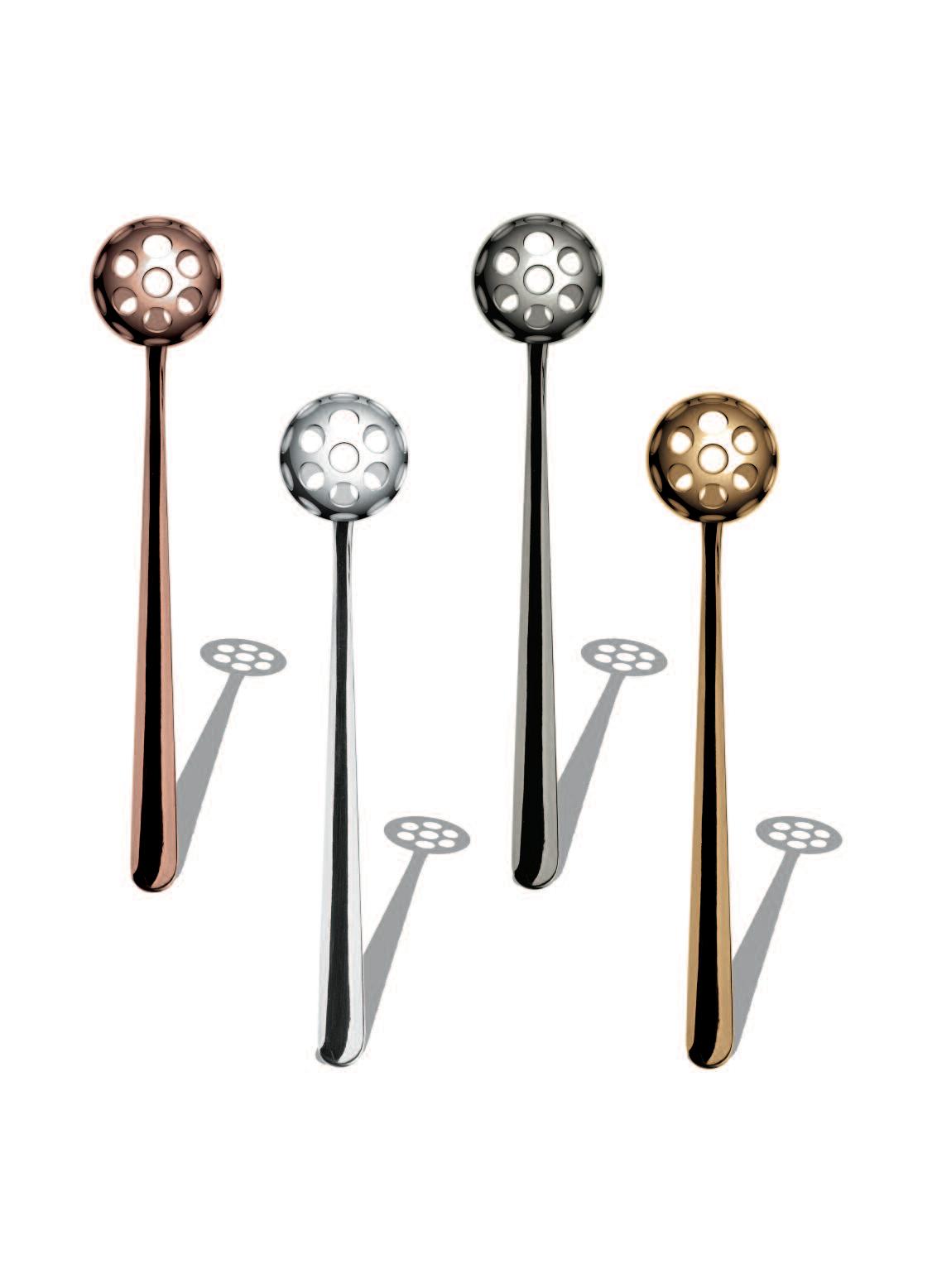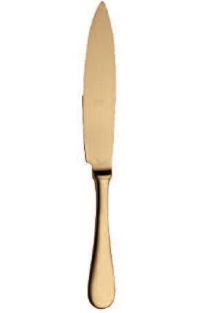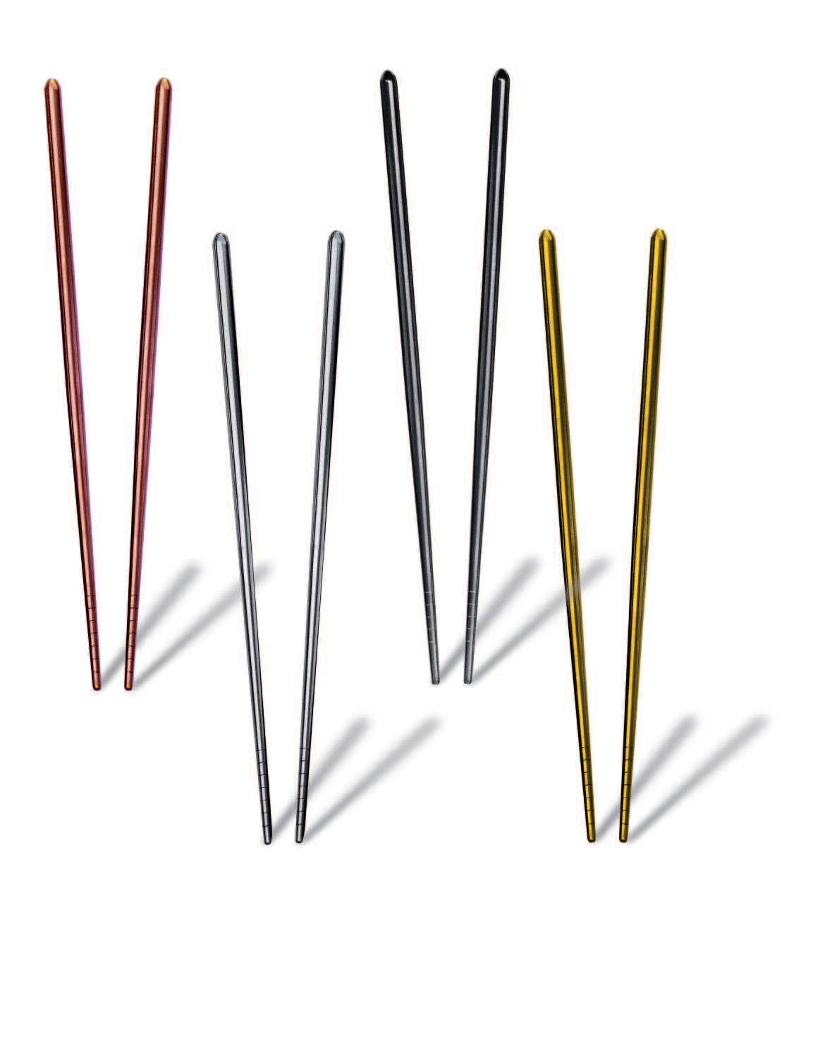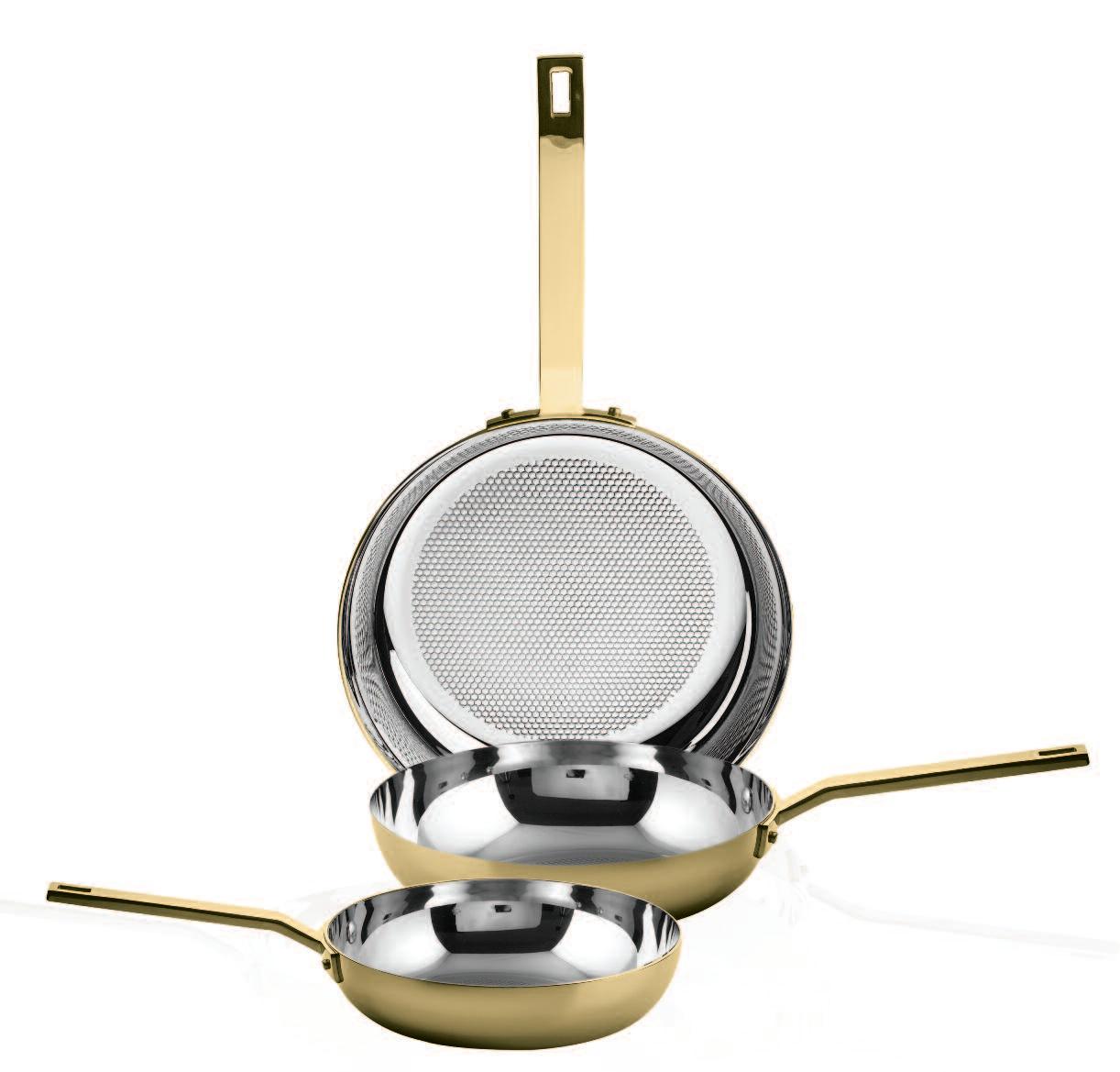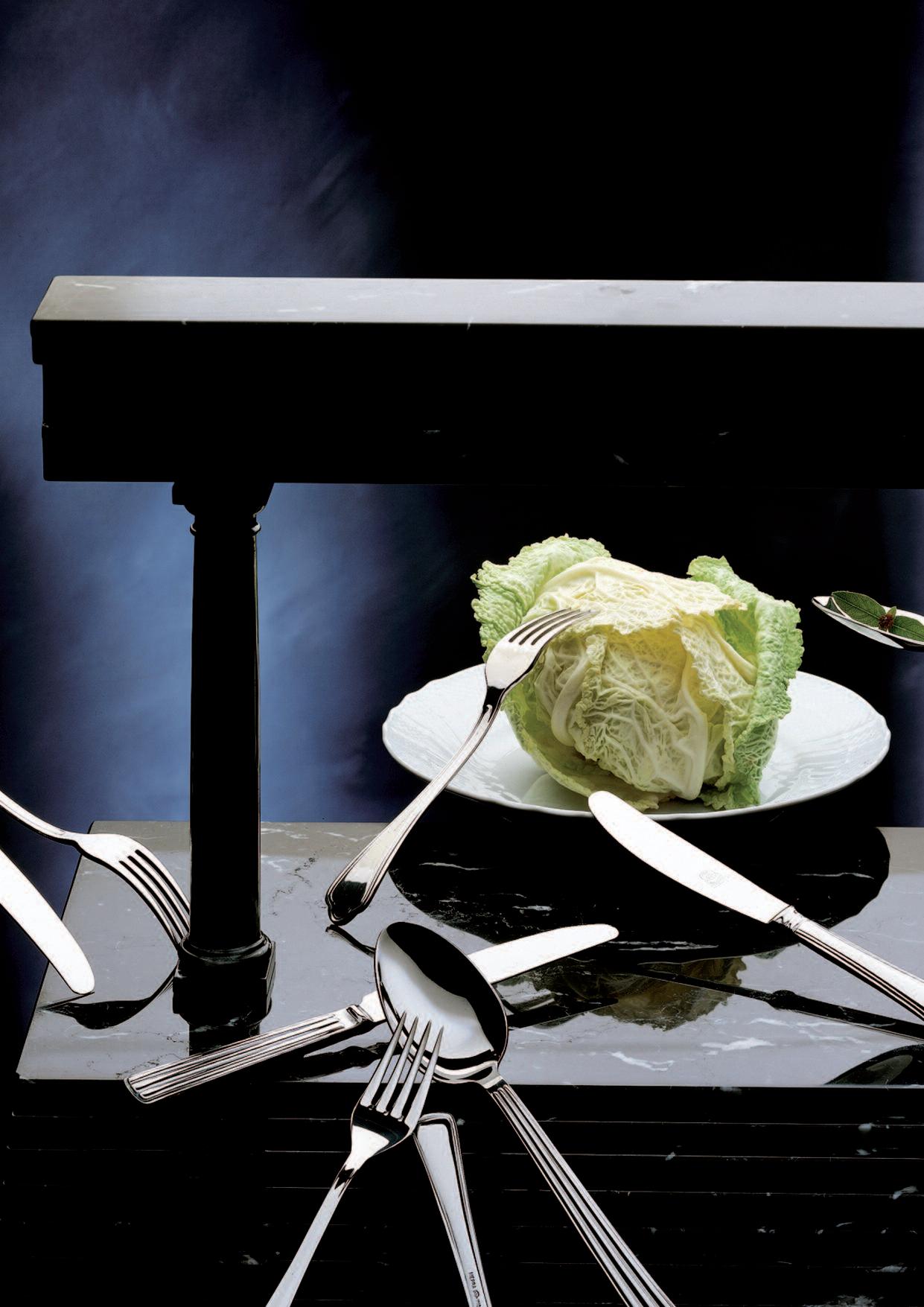 Die hier und vorher abgebildeten Bestecke, die mit einer Oberfläche aus Titan versehen sind, haben exakt die Farbe von Gold(ORO ICE), tiefem Schwarz (ORO NERO) und Bronze (BRONZO), was der Gestaltung von Tischen und Wohnräumen völlig neueAkzente verleiht Das angewendete Veredelungsverfahren (P V D ) kommt aus der Raumfahrttechnik und war bisher bei der Gestaltung von Tabletop-Artikeln noch nie nicht angewendet worden bzw völlig unbekannt