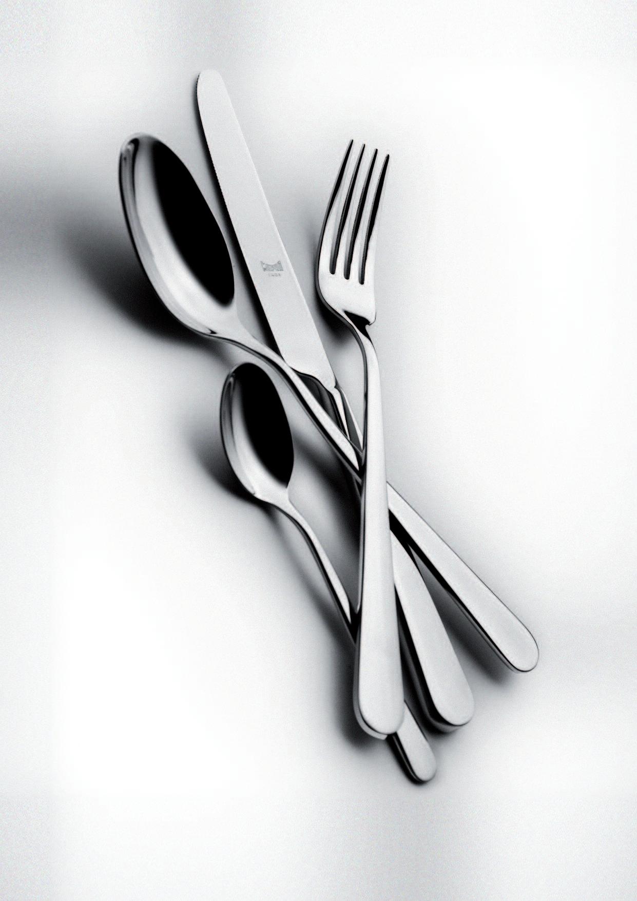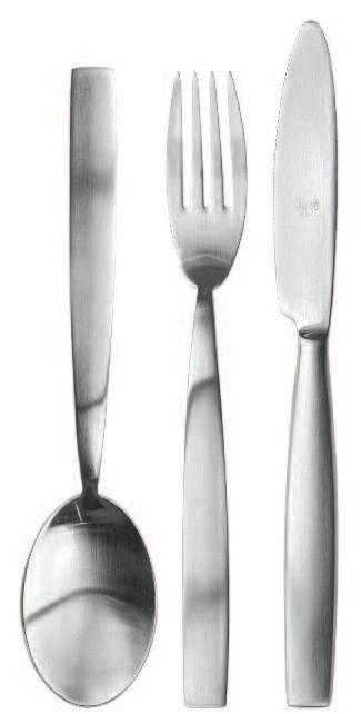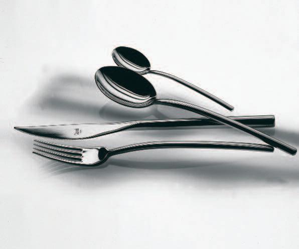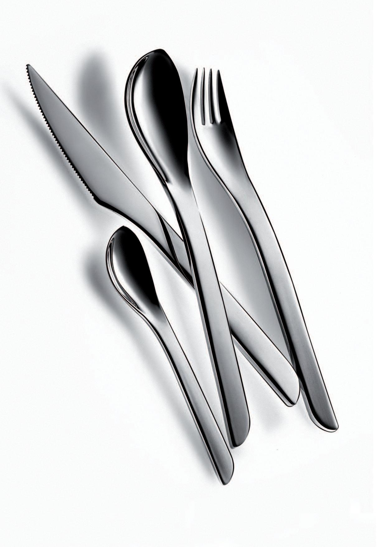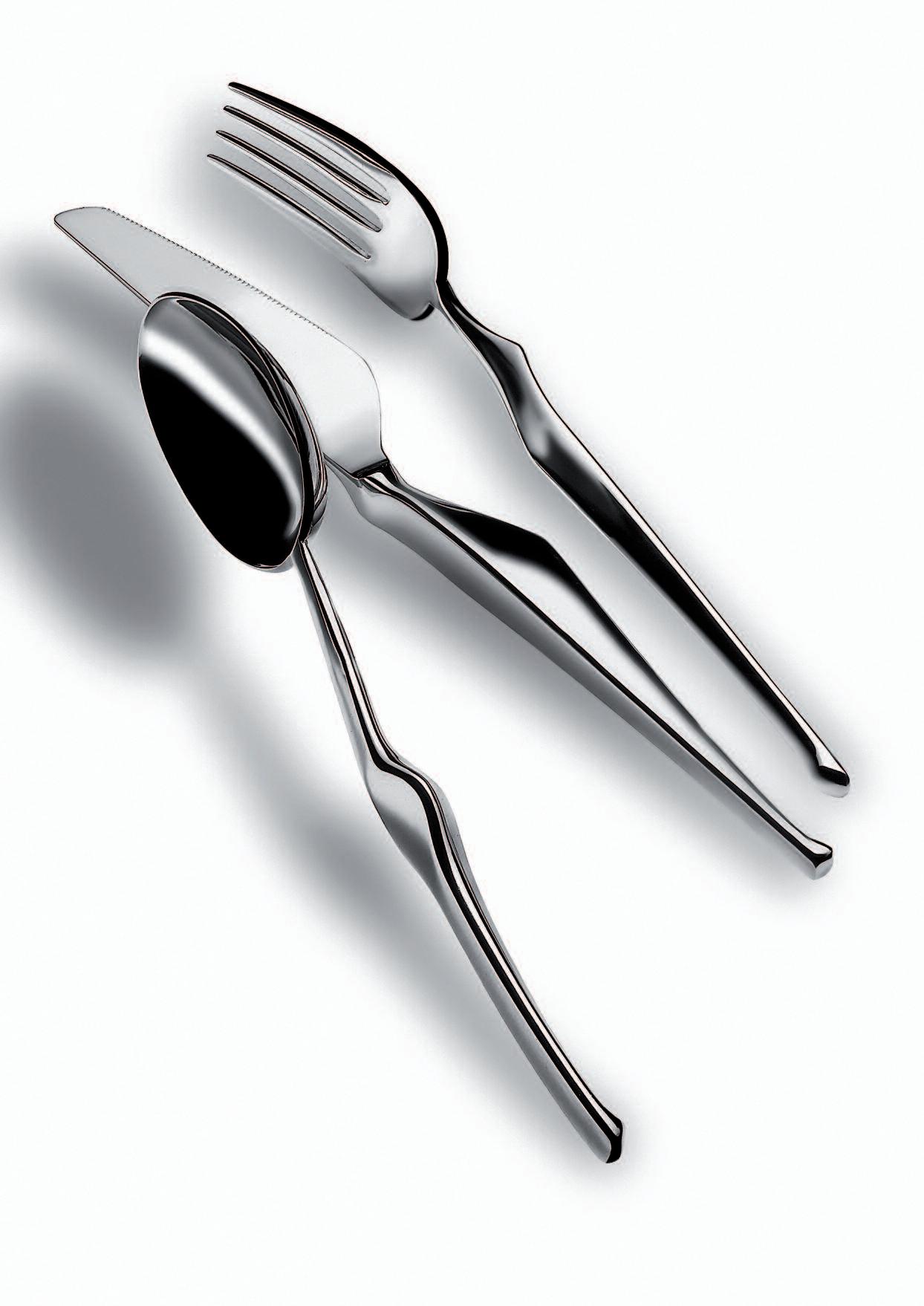 The asymmetrical and rather unfamiliar shape of this cutlery range was influenced by the way we handle certain situations relating to the table routine I was looking at the movements of the hands when dishing food out of bowls, when serving onto a plate and how this movement alters when food is conveyed into the mouth Each piece reflects these movements individually, referring to their purposes and their “actions”, as some pieces are more asymmetrical than others The overall asymmetrical shape of this range therefore supports the comfortable handling of cutlery and also acts as guide to the person who is using it