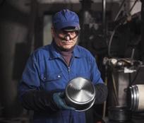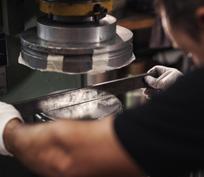 The external surface of the pan is ground and pre-brushed on the automatic grinder. The pan passes through various work stations and the pan base receives its characteristic spiral finish.