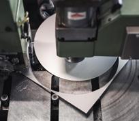 Nous achetons notre matière première, l’acier au chrome-nickel, à un partenaire de longue date qui se trouve en Finlande. Ce matériau nous arrive sous forme de bobines (bandes de tôle enroulées) ou de tôles rectangulaires. Pour pouvoir le transformer en poêle, nous découpons d’abord les tôles en carrés, puis en rondelles.
