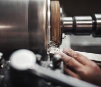Nach dem Löten sind die Aluminiumrondelle und die Bodenplatte aus Chromstahl seitlich nicht bündig. Auf der Drehbank wird das überstehende Material abgedreht, bis der Wärmeleitboden bündig ist.