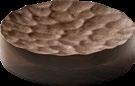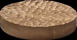 ENGINEERED NATURE. Frittierter Maniok mit lila Süßkartoffelpüree – kredenzt in einer essbaren Kokosnuss-Bowl auf dem neuen Holzplateau ELEVATE. In die Oberfläche des runden Holzblocks wurden feine, regelmäßige Vertiefungen gefräst, die an eine von Wind gekräuselte Wasserfläche erinnern.