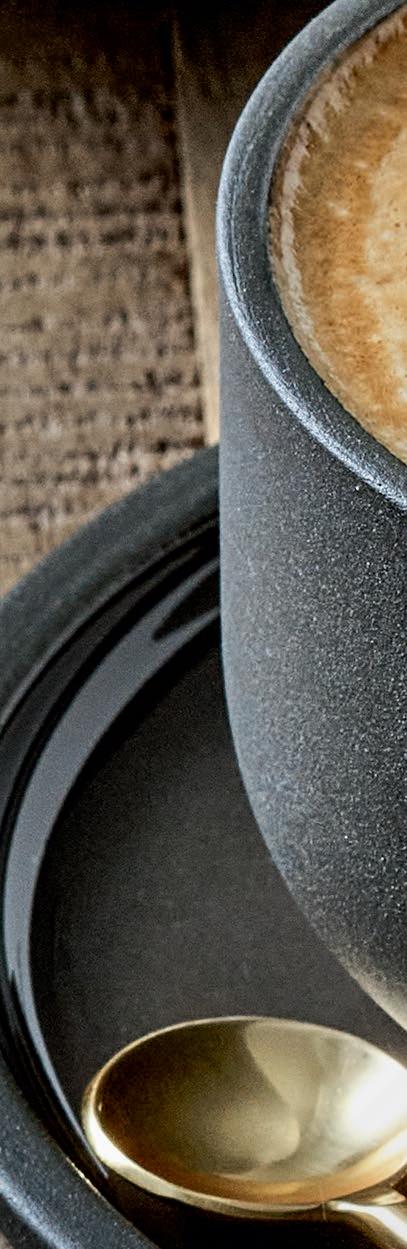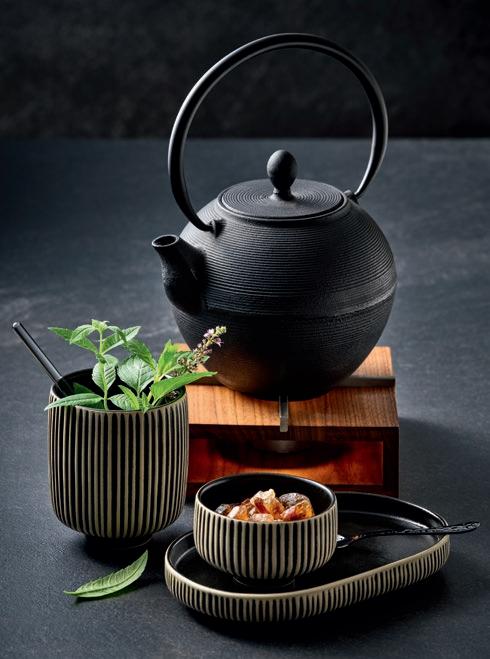 NO-FRILLS. NARA black&white and the cast-iron teapot forgo playful details. The PLAYGROUND serving board presents the smørrebrøds with the comforting charm of wood. Warm-up for the day: Soup served in massive TERRA Bowls.
