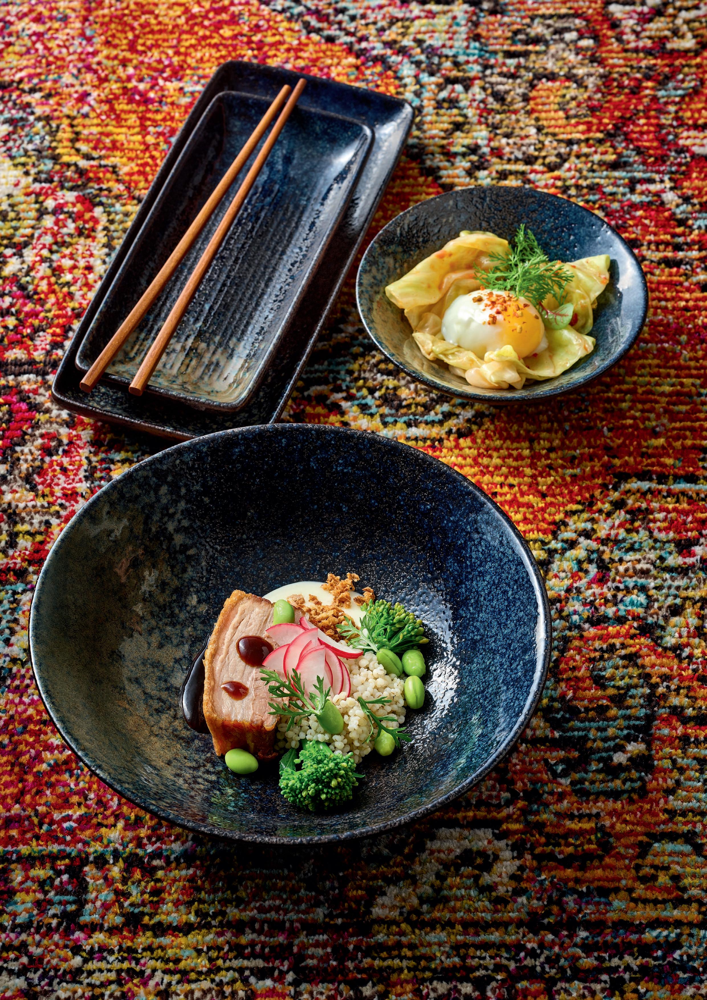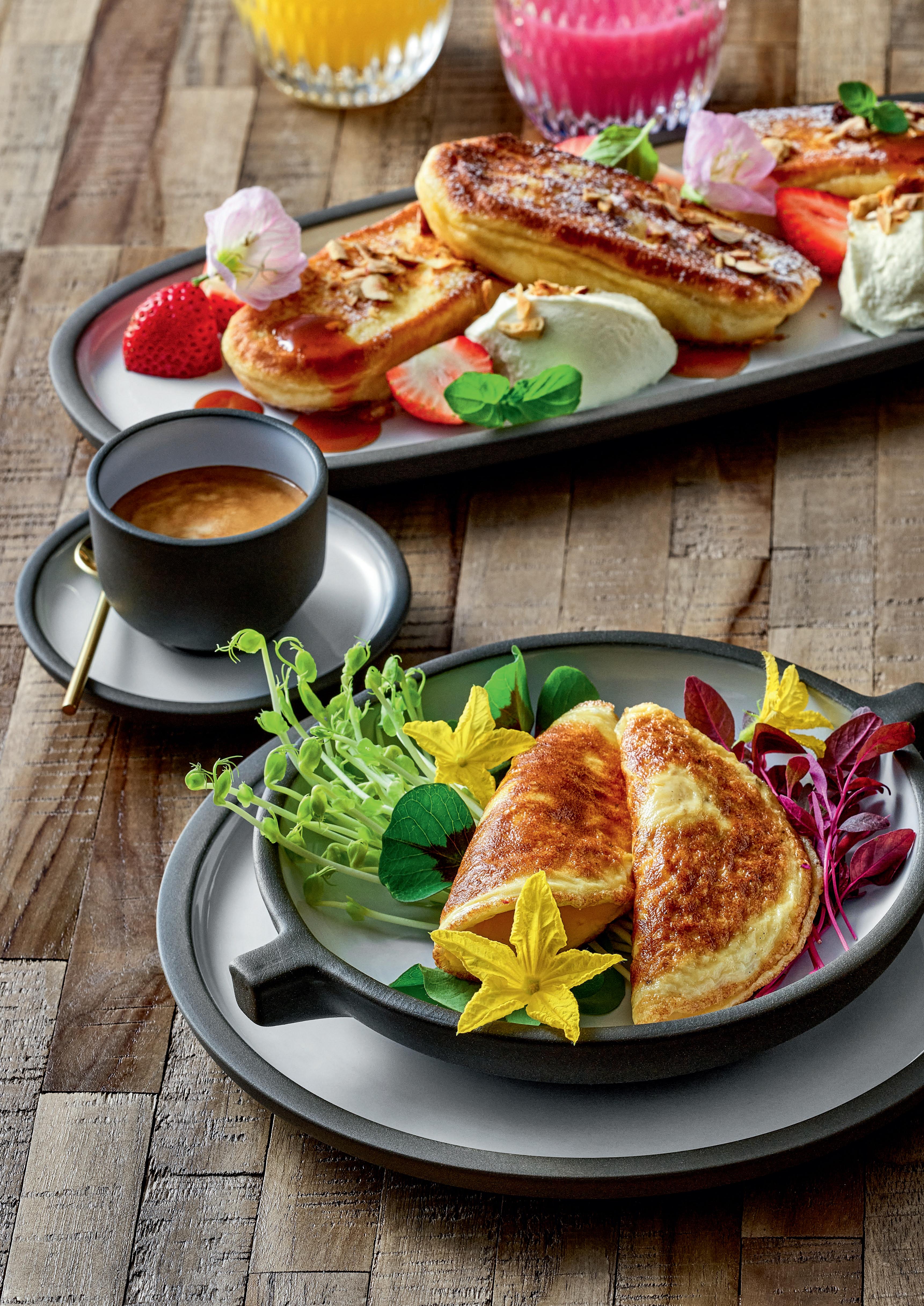 To feast all day long... the new breakfast trend shatters the idea that meals are tied to fixed times of day. From Chinese baozi to Israeli shakshuka and Belgian waffles, national borders are fading, and global cultures are merging and becoming more fluid. Choice is only a matter of imagination and pleasure. In comparison, the classic brunch seems almost old-fashioned. But it’s not just about cosmopolitan delights, but also social exchanges. A vibrant variety of dishes is created with a colorful puzzle of items in versatile materials.