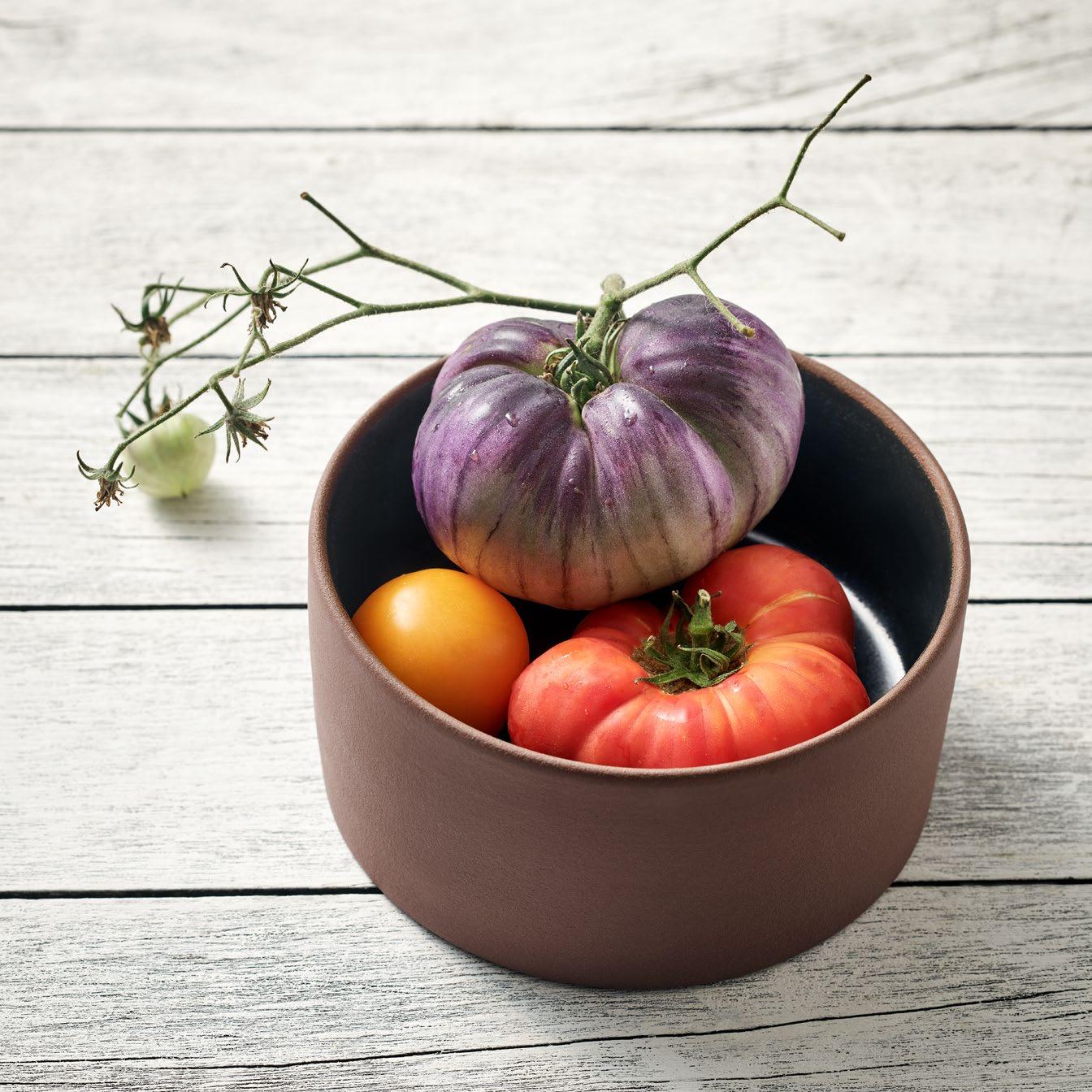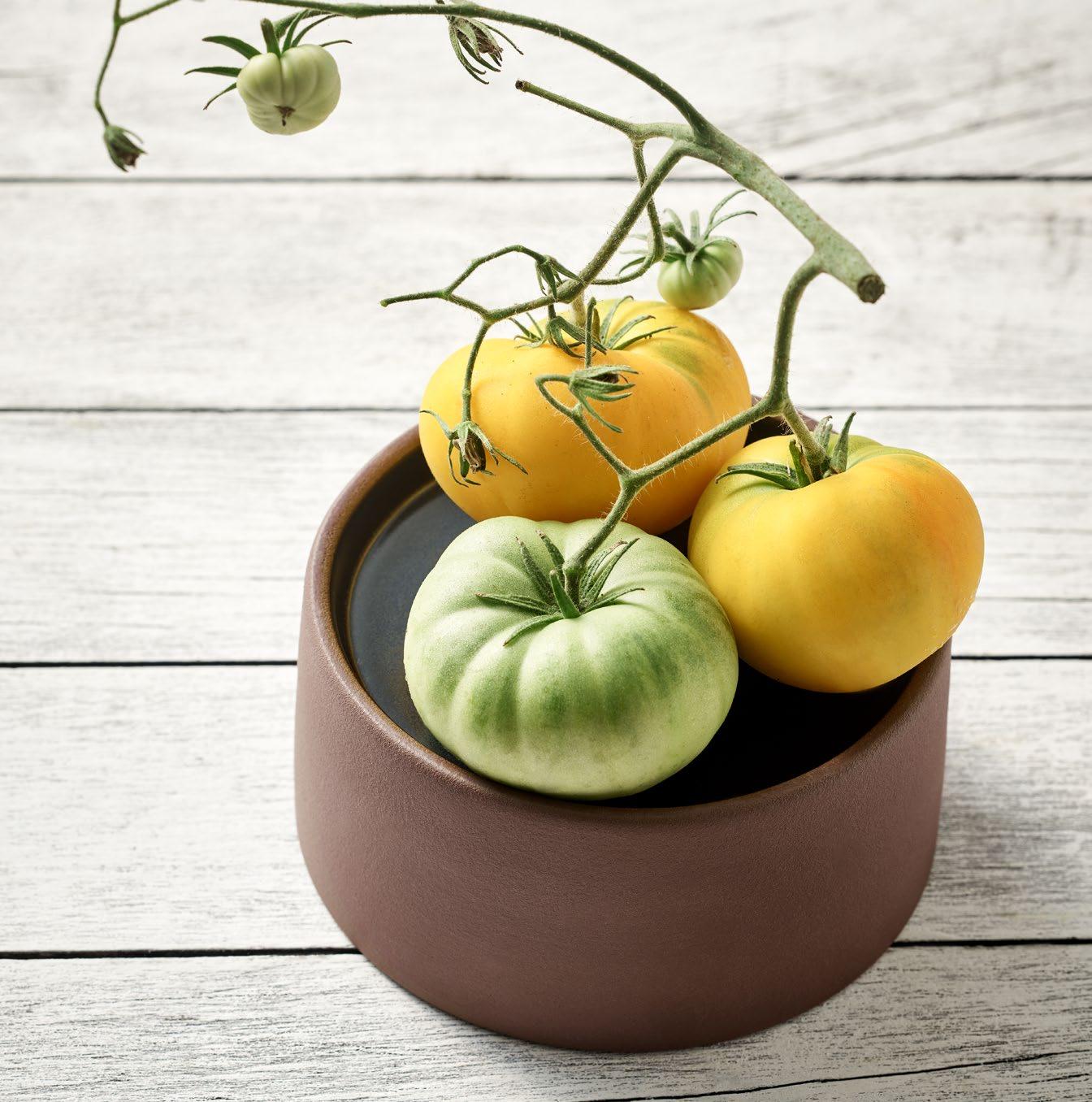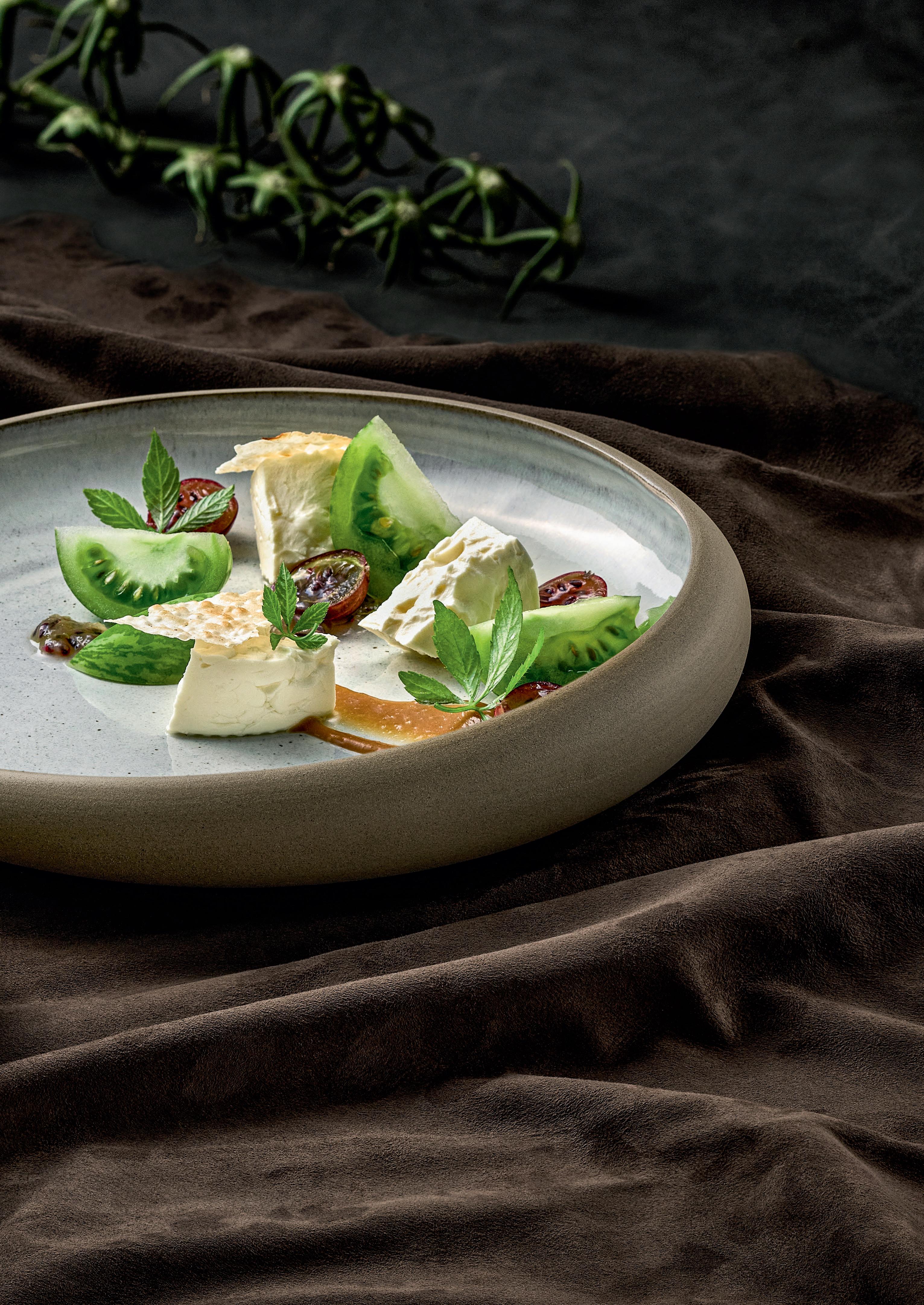 EIN NEUER TON. Achtsamkeit ist das Leitmotiv moderner Lebenshaltung. Vor allem im Umgang mit den Ressourcen unseres Planeten. Das Kurzsortiment EMBRACE ist aus NEW Eco-Gres®, sprich: 90 % recyceltem Ton. Es übersetzt den Respekt vor der Natur in eine weiche Formensprache. Ein behutsames Setting für gepickelte grüne Tomaten mit Stachelbeeren und Hirtenkäse.