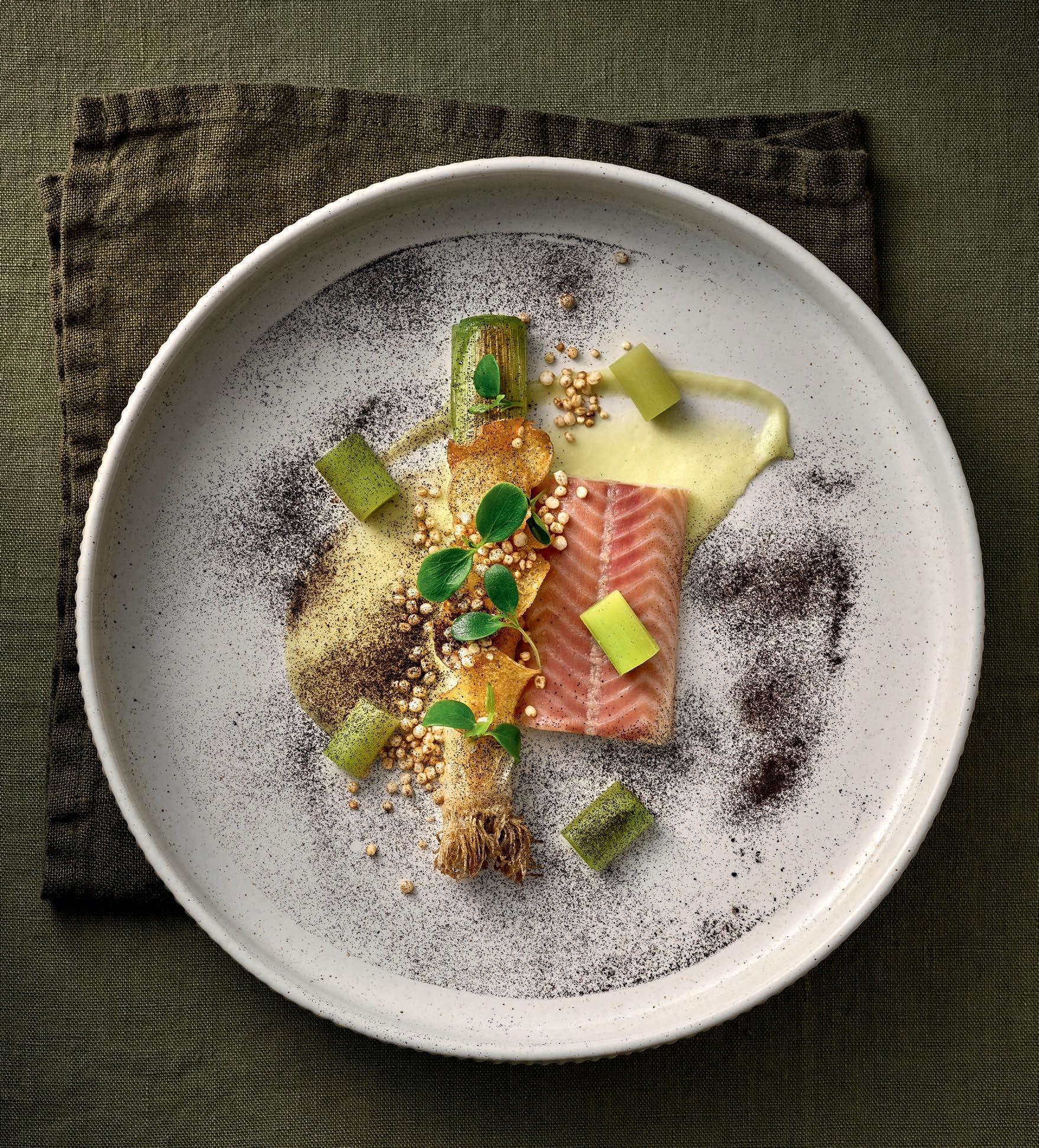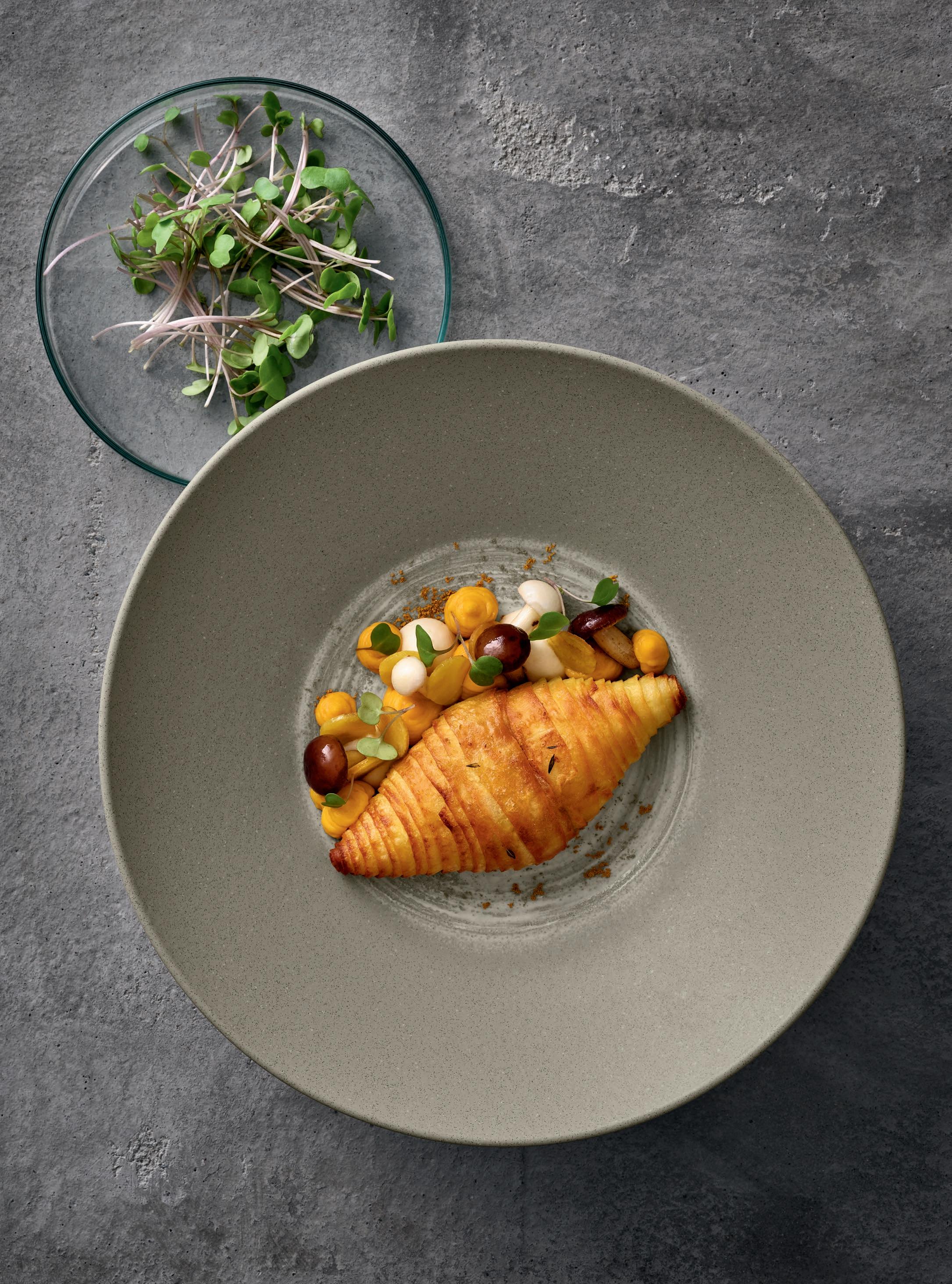 PLANT BASED FOOD. Kartoffeln erleben als vielseitige Energielieferanten ein Revival. Hier dekonstruiert als Croissant auf SILENTO. Gemüse lässt sich zu feinen Schäumchen, Terrinen und Cremes verarbeiten. Präsentiert auf NARA-Teller mit weißem Relief.